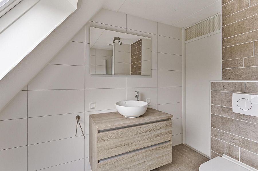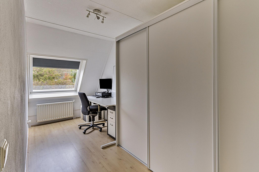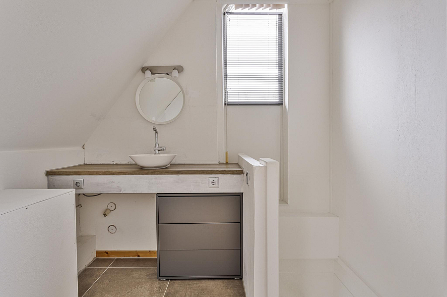 2E VERDIEPING: Overloop met vaste wastafel, ruime 4e slaapkamer met 2 grote dakramen en bergruimte achter de knieschotten.