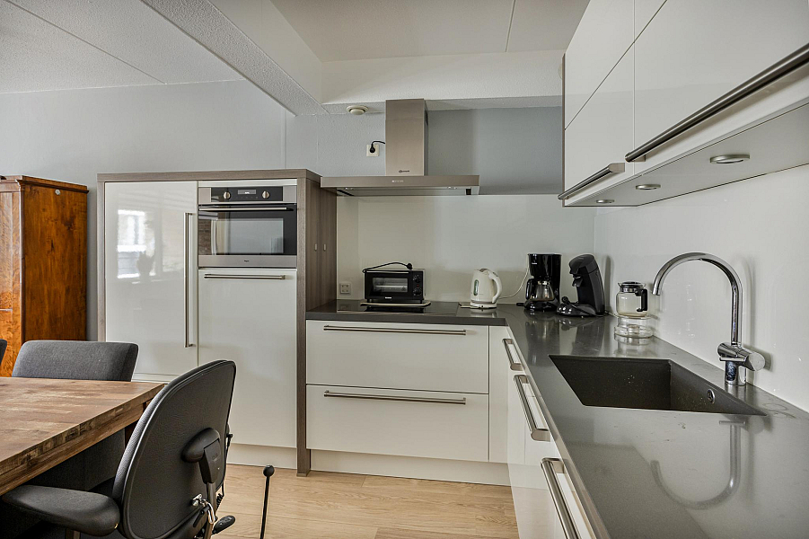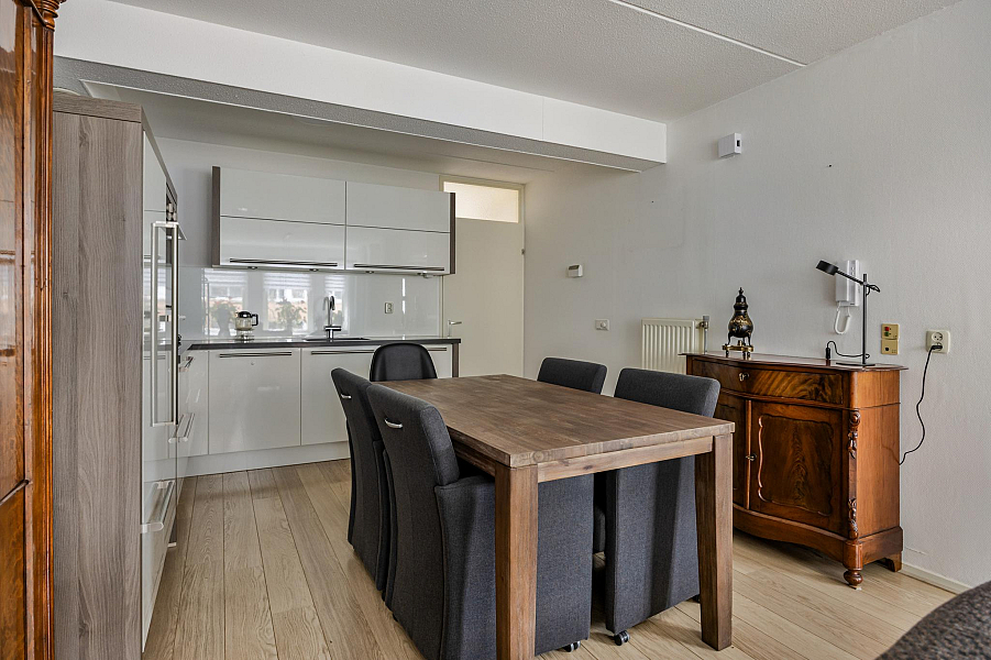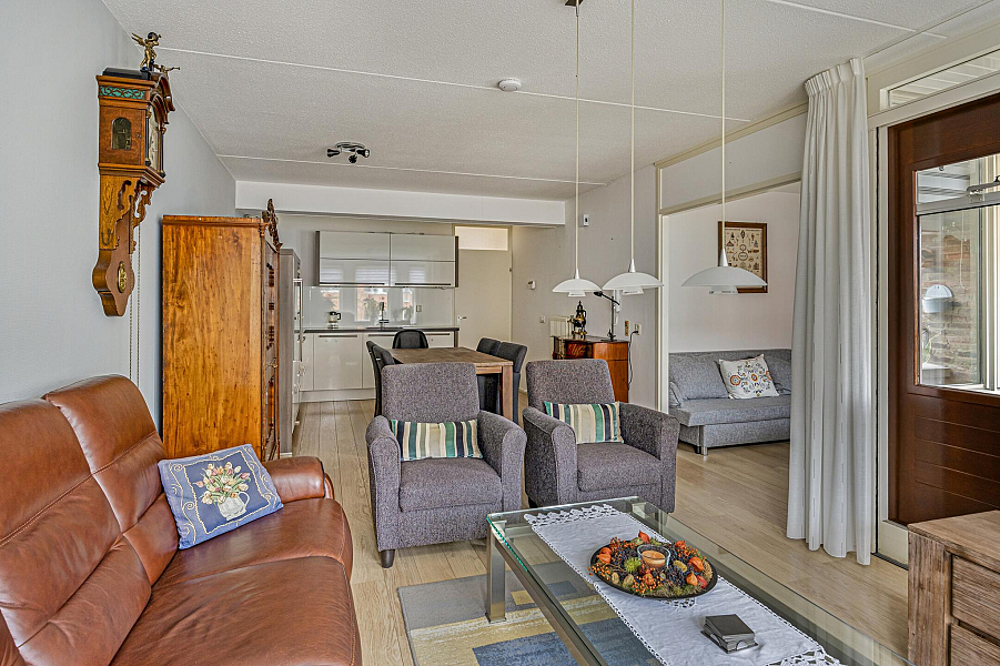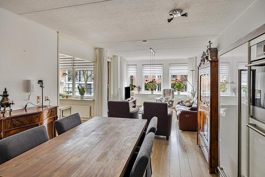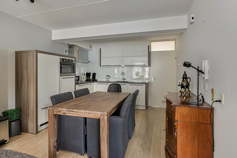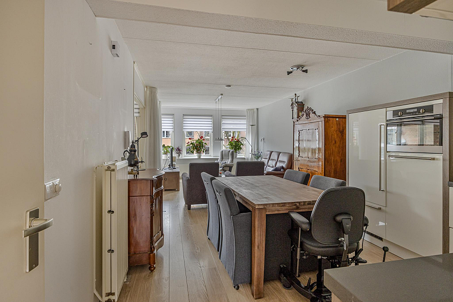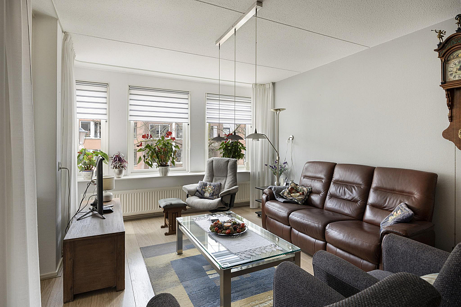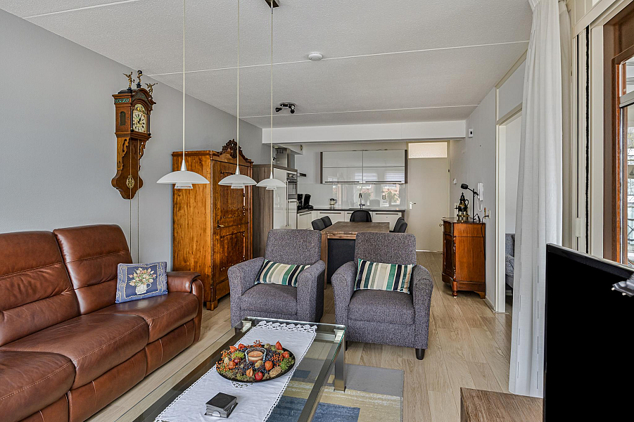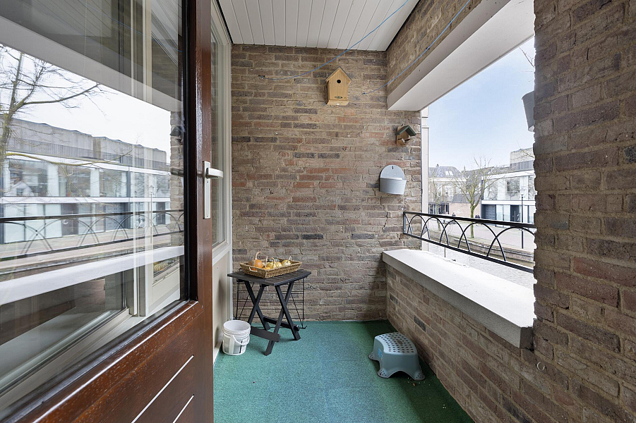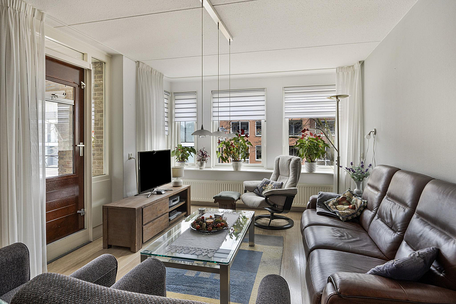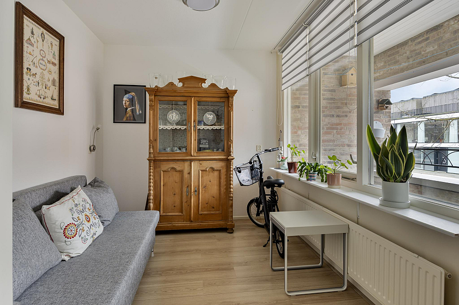 Vanuit de hal bevindt zich aan de voorzijde de speelse en zonnige woonkamer met laminaatvloer alsook de moderne keuken (2015). De kleine slaapkamer aan de voorzijde is momenteel bijgetrokken bij de woonkamer. Het balkon is te bereiken middels een deur in de woonkamer.