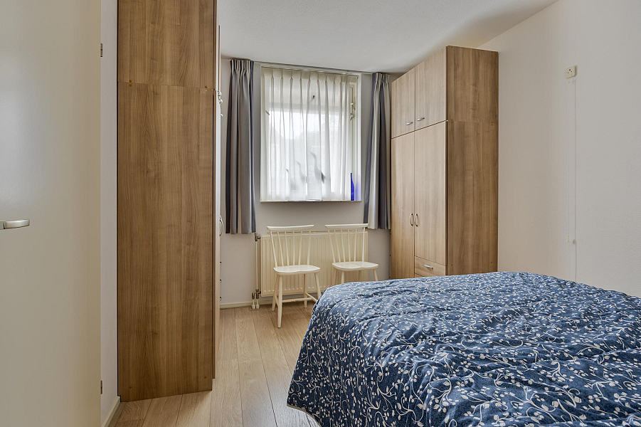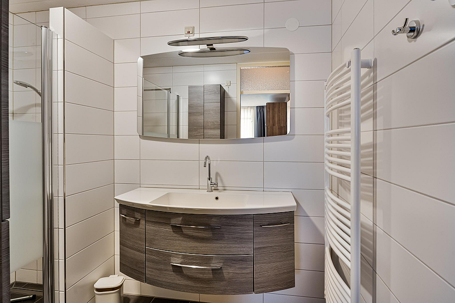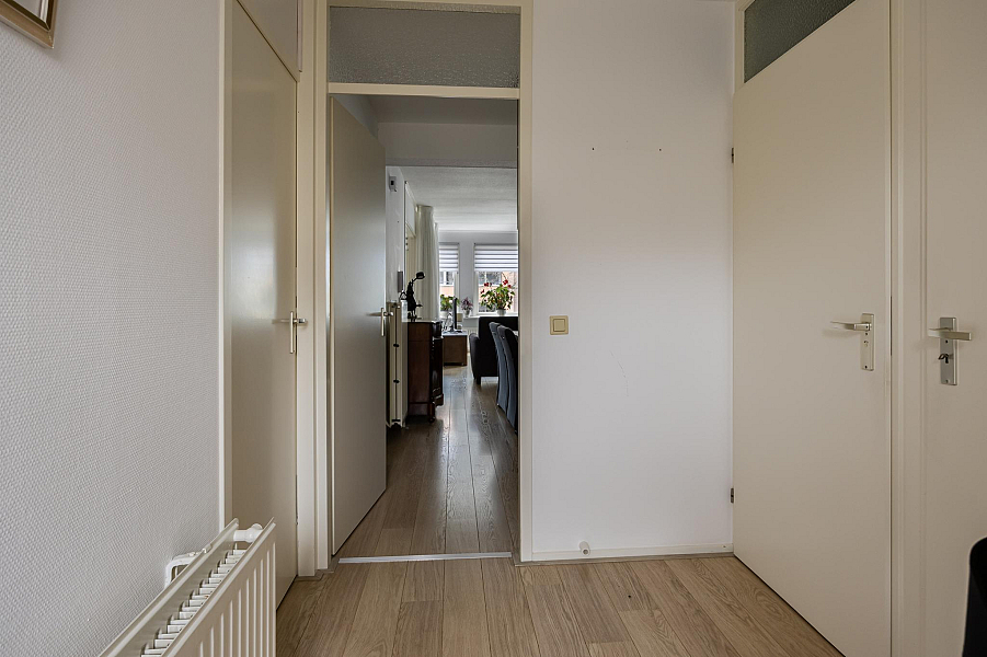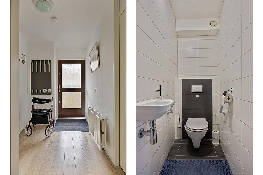 Entree met de royale hal, meterkast, CV kast met witgoedaansluiting, toegang tot de slaapkamer, met mogelijkheid voor het plaatsen van 2 kasten. Verderop bevindt zich het toilet met wandcloset en fontein en de badkamer welke is voorzien van inloopdouche met glazen deur, wastafelmeubel en designradiator.