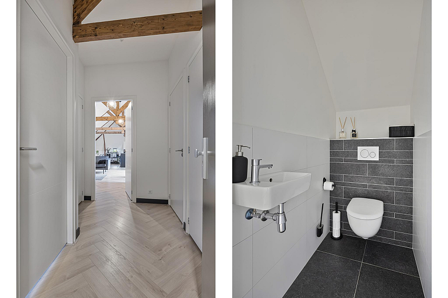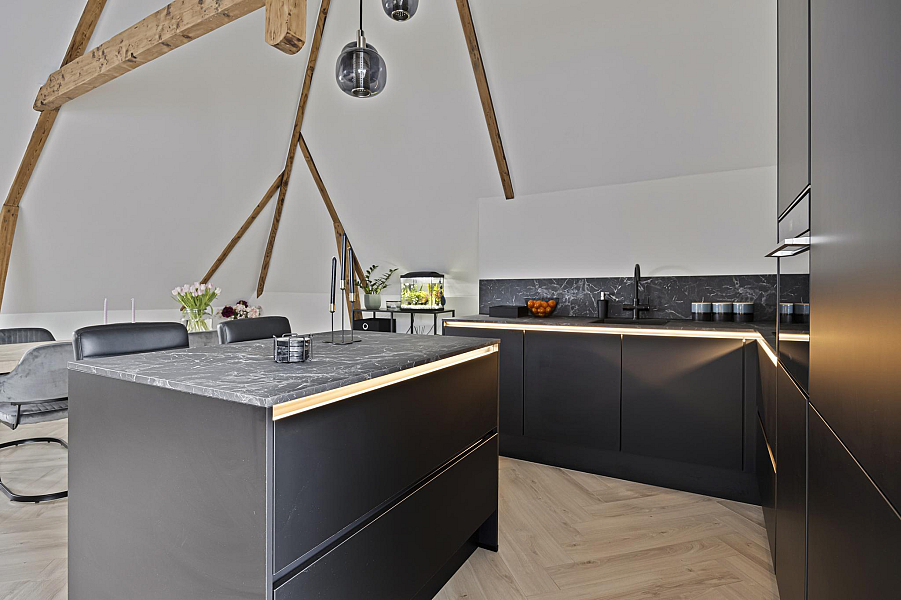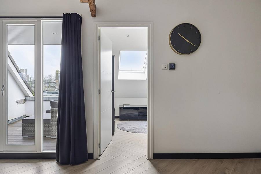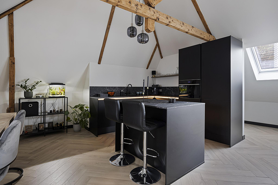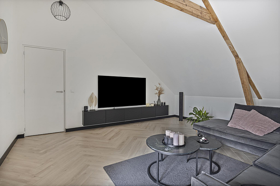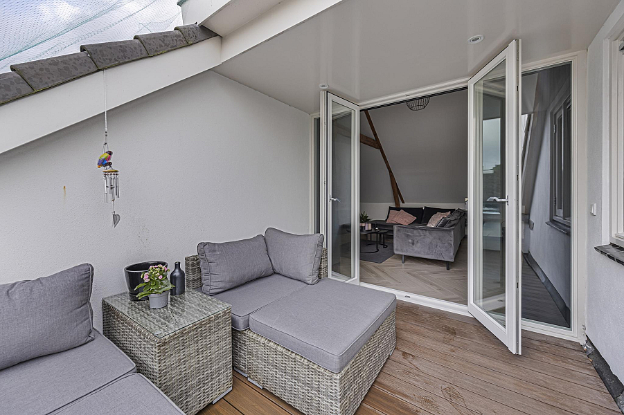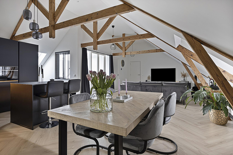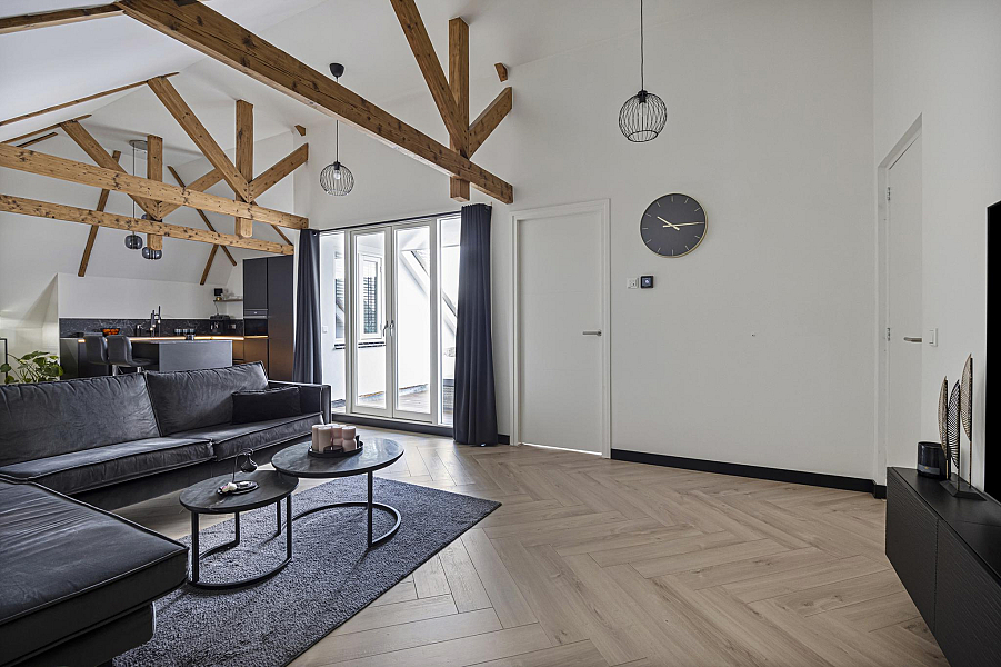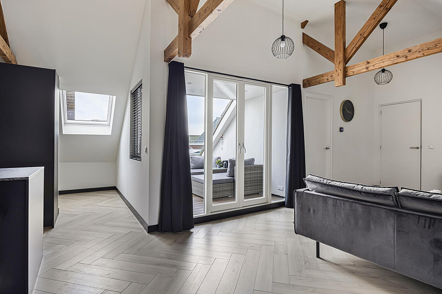 WOONETAGE: Entree/hal, toiletruimte met hangend toilet en fontein, badkamer met douchecabine en wastafelmeubel, fraaie woonkamer met een hoog plafond van ca. 4,2 meter! hoog met prachtige houten balken, een mooie visgraatvloer met vloerverwarming en veel lichtinval door de dakkapellen, dakramen en de openslaande deuren naar het zonnig gelegen dakterras waar je heerlijk kunt loungen! De moderne open keuken is voorzien van een werkeiland en inbouwapparatuur (o.a. Bora inductiekookplaat met ingebouwde afzuiging, combi-oven, kokendwaterkraan, vaatwasser, koelkast en vriezer) en naastgelegen berg/provisieruimte, 2 goede slaapkamers van circa 14m2 en 7m2, berging met opstelplaats voor de cv-ketel en het witgoed.