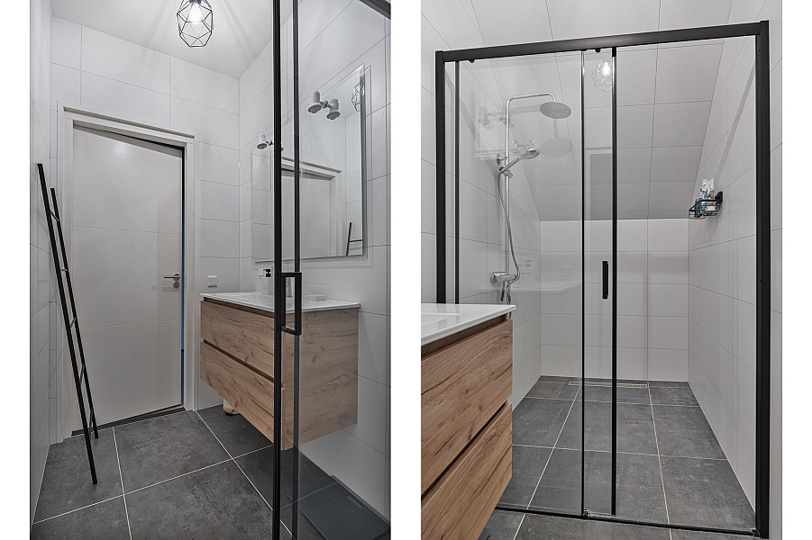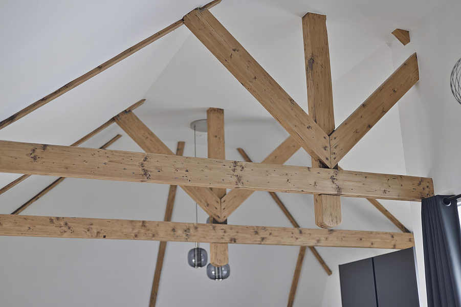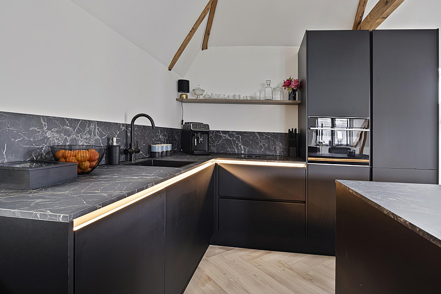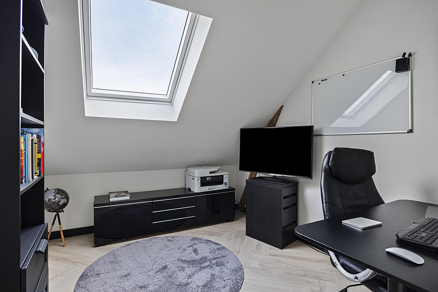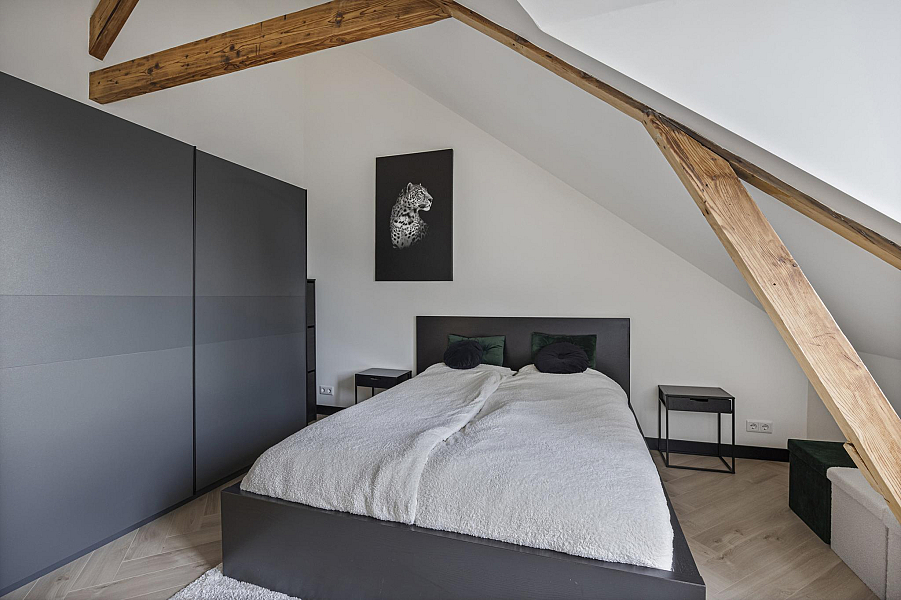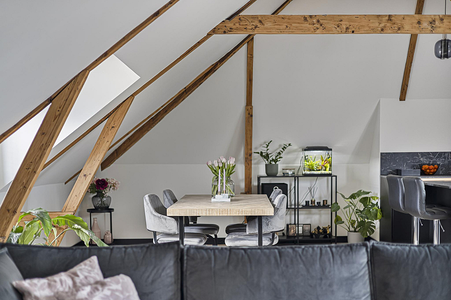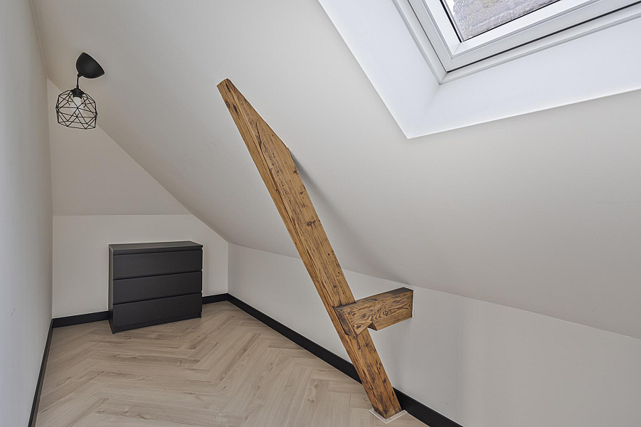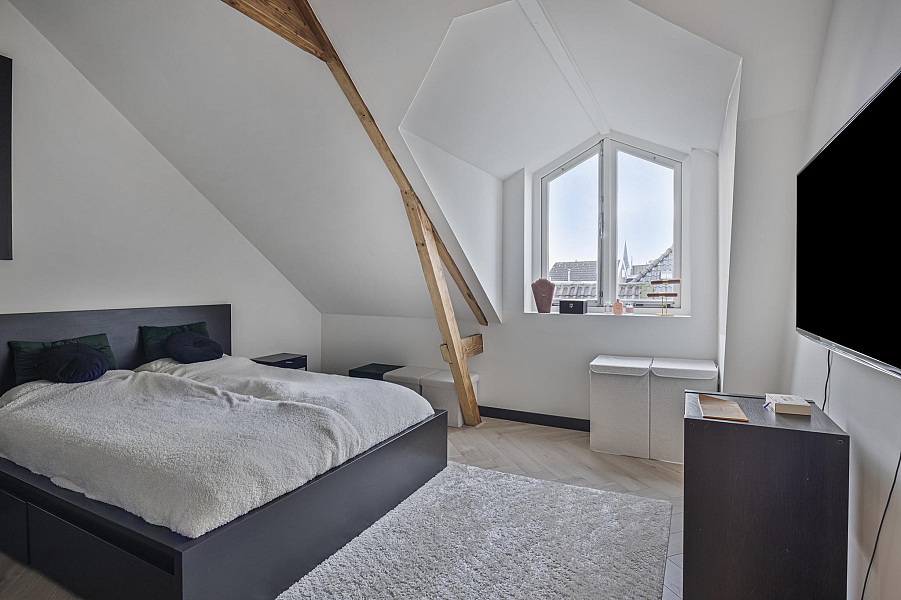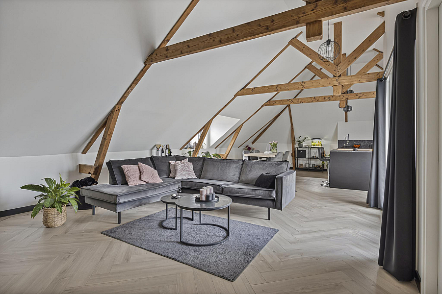 WOONETAGE: Entree/hal, toiletruimte met hangend toilet en fontein, badkamer met douchecabine en wastafelmeubel, fraaie woonkamer met een hoog plafond van ca. 4,2 meter! hoog met prachtige houten balken, een mooie visgraatvloer met vloerverwarming en veel lichtinval door de dakkapellen, dakramen en de openslaande deuren naar het zonnig gelegen dakterras waar je heerlijk kunt loungen! De moderne open keuken is voorzien van een werkeiland en inbouwapparatuur (o.a. Bora inductiekookplaat met ingebouwde afzuiging, combi-oven, kokendwaterkraan, vaatwasser, koelkast en vriezer) en naastgelegen berg/provisieruimte, 2 goede slaapkamers van circa 14m2 en 7m2, berging met opstelplaats voor de cv-ketel en het witgoed.