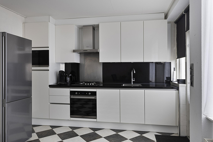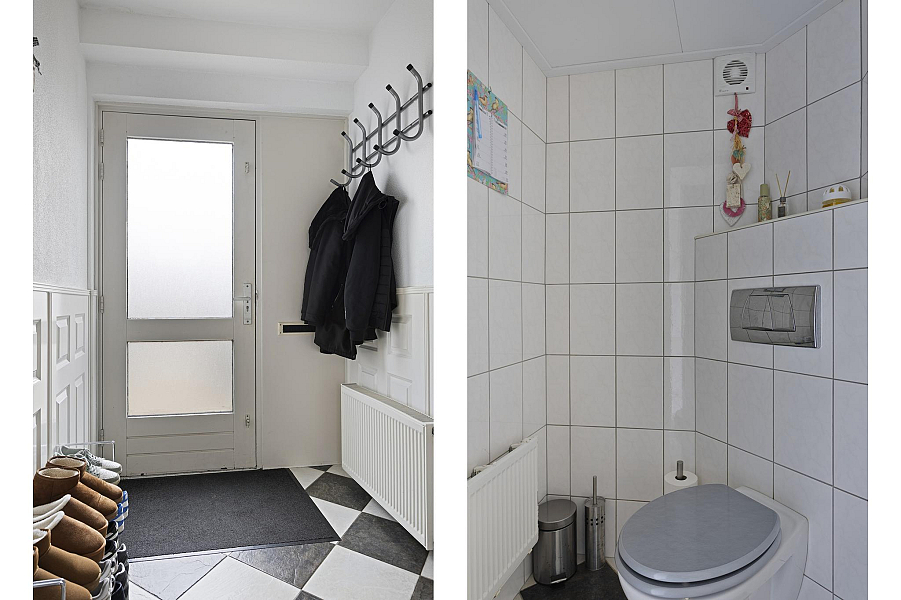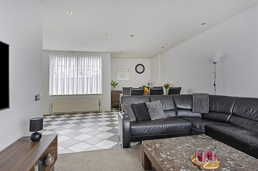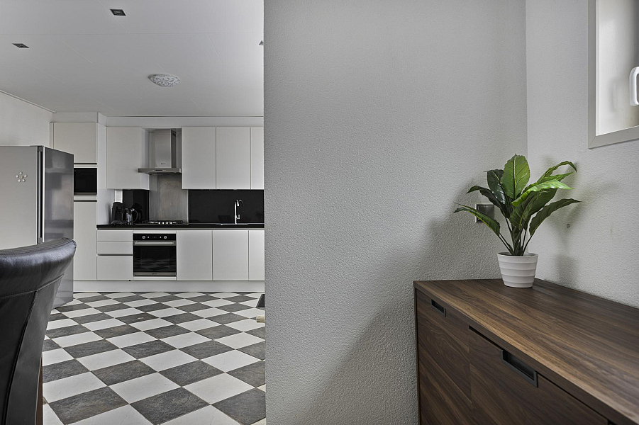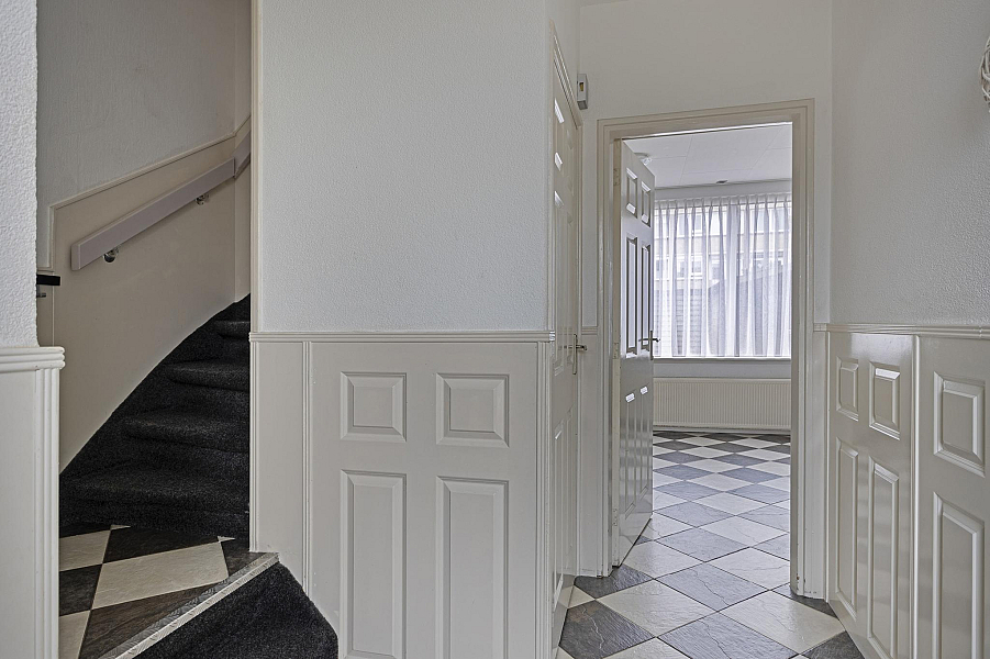 BEGANE GROND: Entree/hal met lambrisering en trapopgang naar eerste verdieping en praktische trapkast, toilet met wandcloset, vergrote woonkamer met plavuizen vloer en tuindeur naar de zonnige achtertuin, open keuken (2018) met inbouwapparatuur (o.a. 4-pits gaskookplaat, oven, magnetron, afzuigkap en vaatwasser).