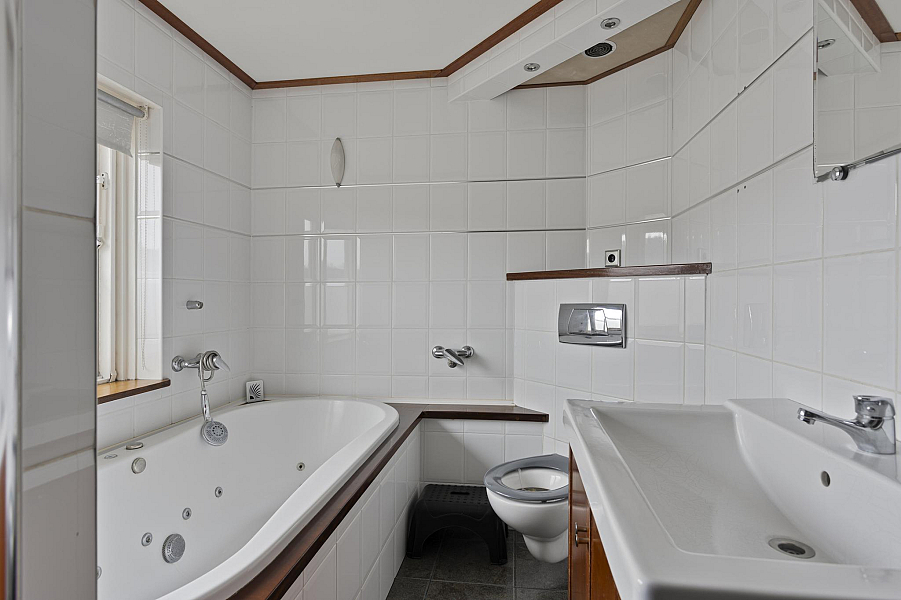 1E VERDIEPING: Overloop, was-/droogruimte met een semi-vaste trap naar de 2e verdieping, 3 slaapkamers (waarvan 1 met balkon en nis voor de tv) en luxe badkamer met whirlpool, douchecabine, 2e toilet, wastafelmeubel en design-radiator. De gehele verdieping is afgewerkt met een laminaatvloer.