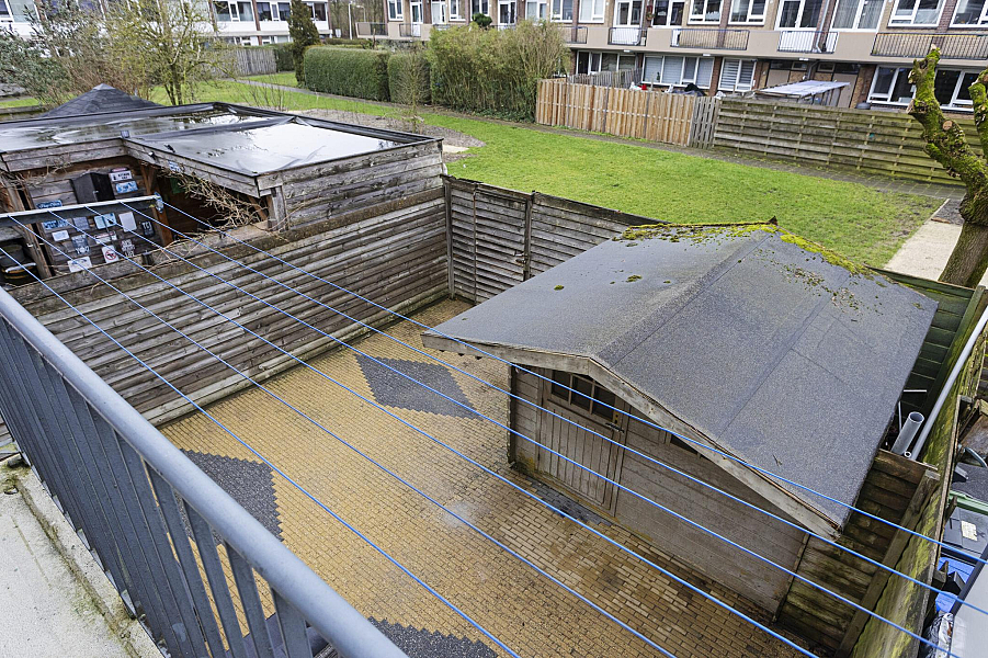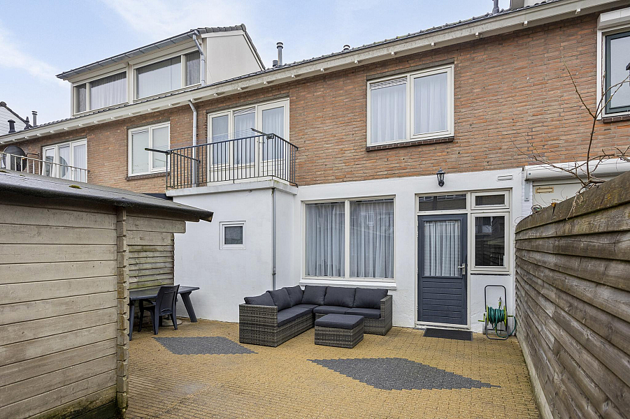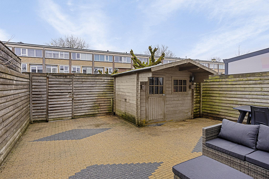 De achtertuin is gelegen op het oosten, hier staat nog een vrijstaande houten schuur welke is voorzien van elektra. De achtertuin is ook middels een achterom bereikbaar.