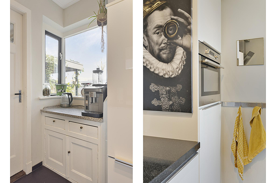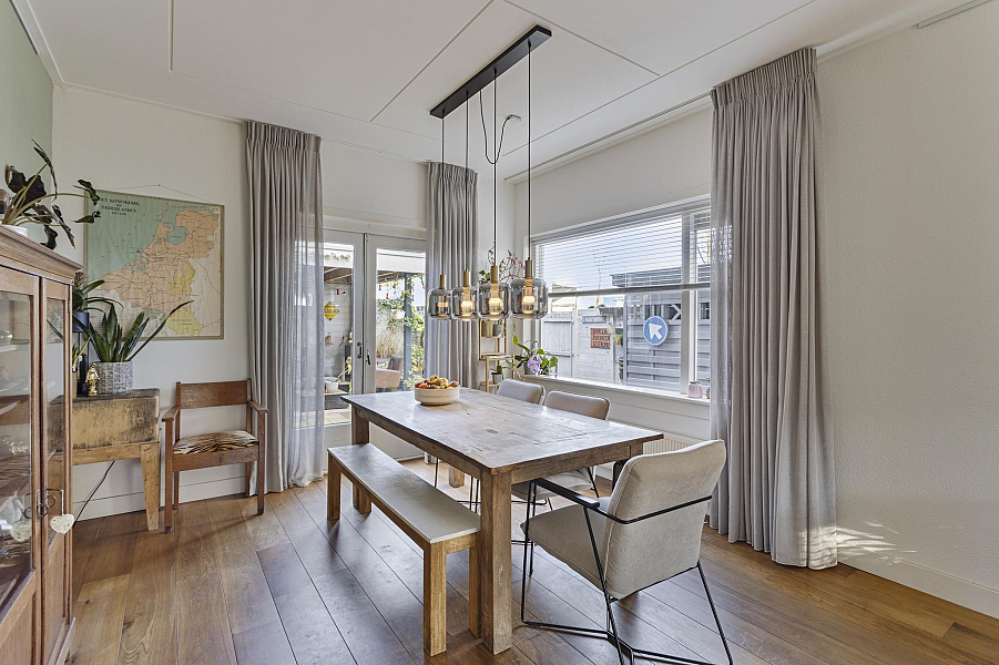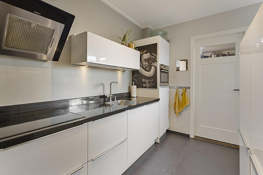 Begane grond: De entree met vestibule is voorzien van fraai tegelwerk en geeft toegang tot de hal met eiken vloerdelen, onder de trappartij is het toilet en de provisieruimte gesitueerd. Aan de achterzijde ligt de gezellige dichte keuken die is voorzien van een nieuwe keukeninrichting (2016) en diverse apparatuur (o.a. combi oven, inductiekookplaat, koelkast, vriezer, vaatwasser en afzuigkap). De keuken is geriefelijk door de gezellige raampartij en een authentiek keukenblokje. Via de keuken is de ruime bijkeuken bereikbaar. De lichte woonkamer voorzien van eiken vloerdelen en tuindeuren is straatgericht met een levendig uitzicht.