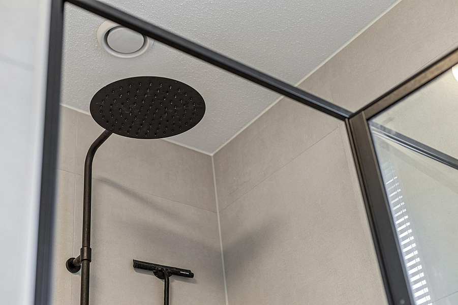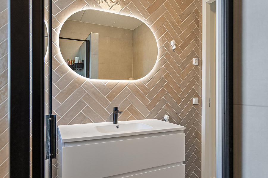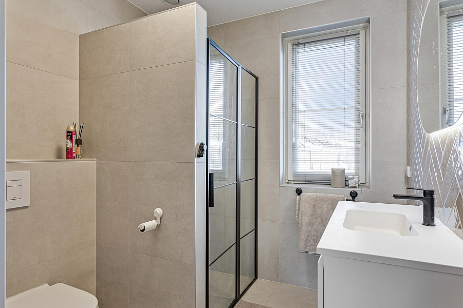 • Moderne badkamer: De badkamer is zeer fraai afgewerkt, met een stijlvol visgraatmotief op de wand, een ruime inloopdouche, een wastafel en een toilet.