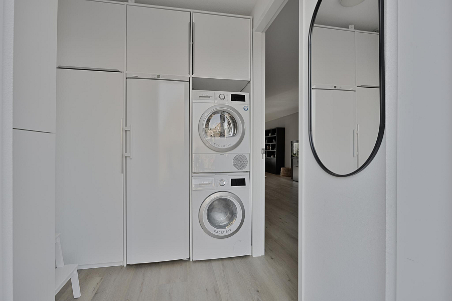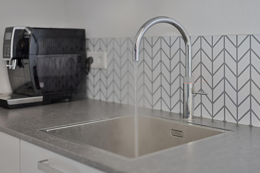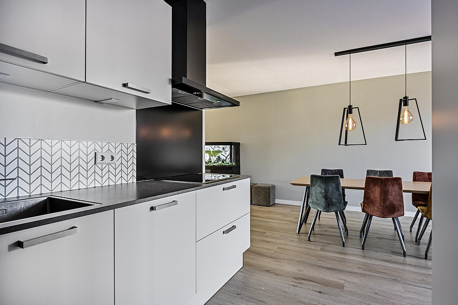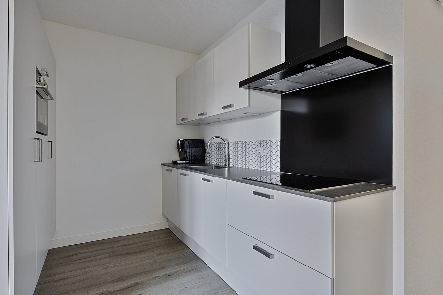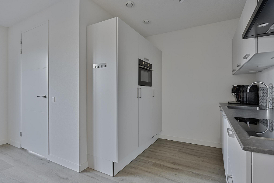 De nette keuken is van alle gemakken voorzien, waaronder een koelkast, vaatwasser, inductiekookplaat, Quooker en combioven. Aan de achterzijde bevindt zich nog een bijkeuken met aansluiting voor een wasmachine en droger.