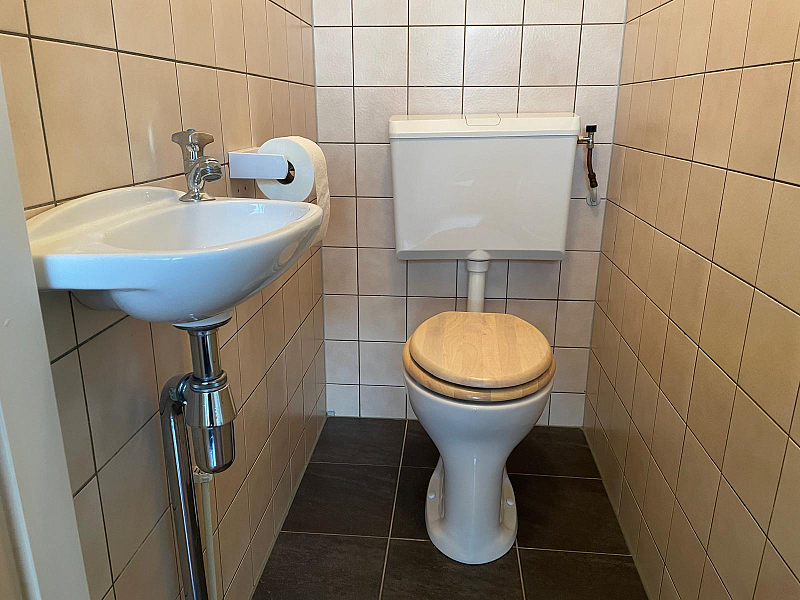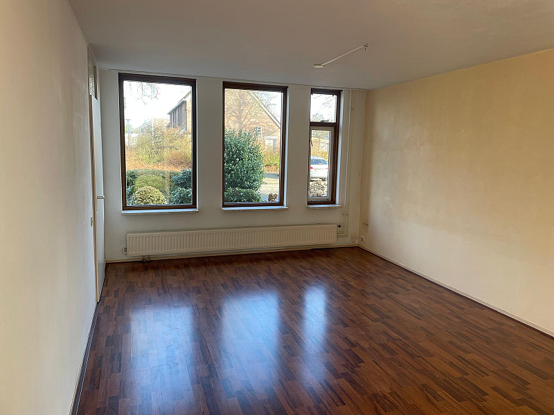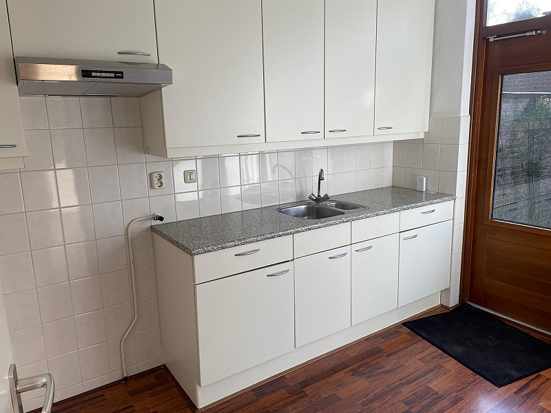 Entree met toilet, lichte Z-vormige woonkamer met laminaatvloer. Half open keuken met standaard keukenblok, tussenhal met berging en trapopgang.