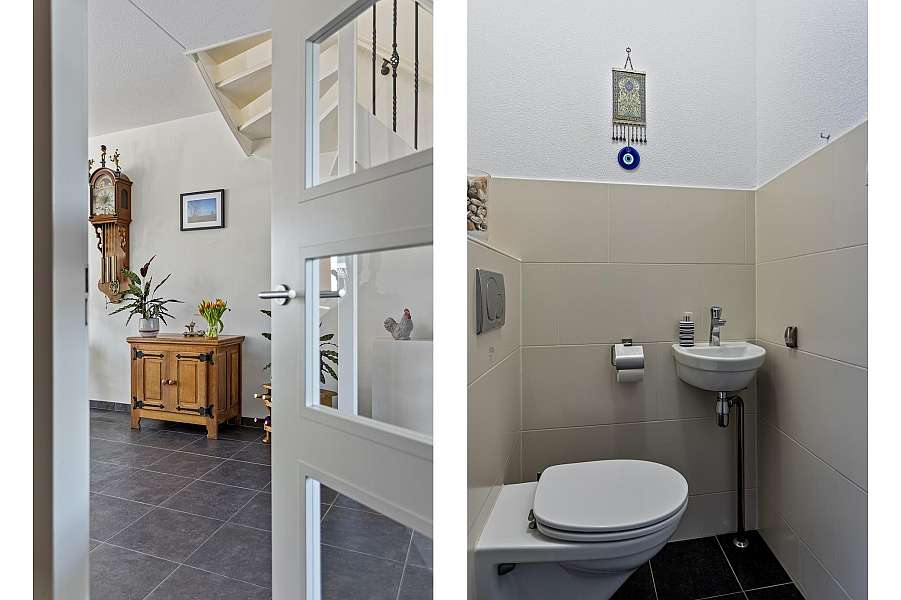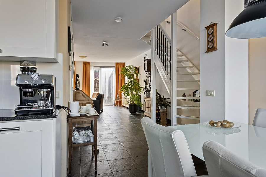 BEGANE GROND: Zeer ruime entree/hal met doorgang naar de aangebouwde garage/berging, toiletruimte met hangend toilet en fontein, straatgerichte en lichte open keuken met vernieuwde fronten en inbouwapparatuur (o.a. 4-pits gaskookplaat, afzuigkap, combi-oven en recent vernieuwde koelkast en vaatwasser) en tuingerichte woonkamer met deur naar de op het zuiden gelegen achtertuin en trapopgang naar de verdieping.