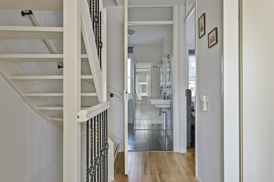 1E VERDIEPING: Overloop, 3 goede slaapkamers van 6m2, 13m2 en 13m2, ruime badkamer met douchecabine, vaste wastafel en 2e toilet, ook hier een fraaie opengewerkte vaste trap naar ...