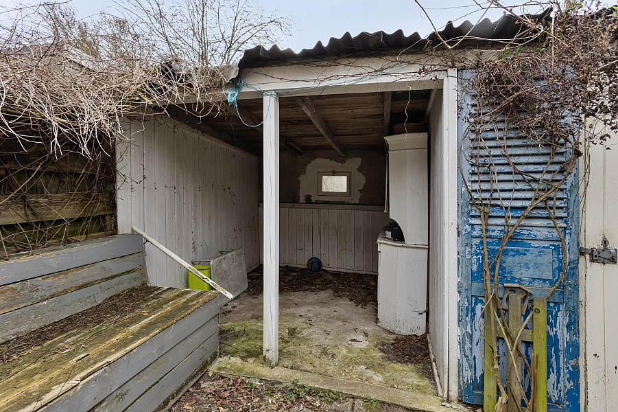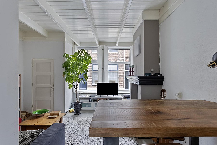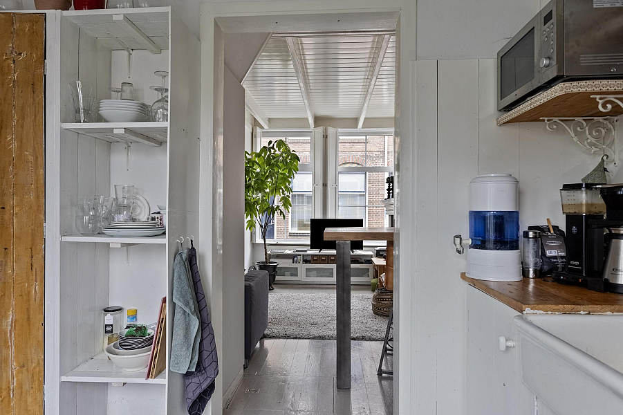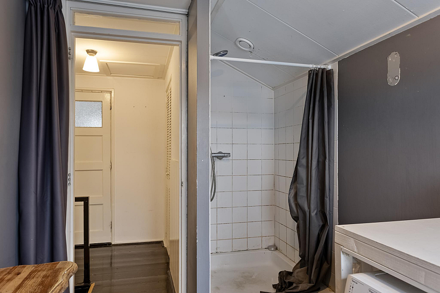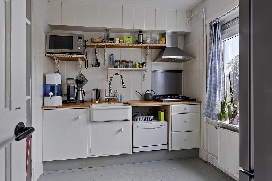 Tochtportaaltje, straatgerichte woonkamer met sfeervolle raamluiken, originele balkenplafond, en een prachtige schouw met aansluiting voor een houtkachel, keuken met enige inbouwapparatuur, tussenhalletje met toilet en trapopgang. De begane grond heeft een mooie houten vloer. De achtertuin heeft nog een vrijstaande stenen schuur.
