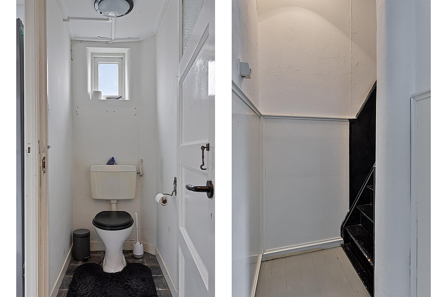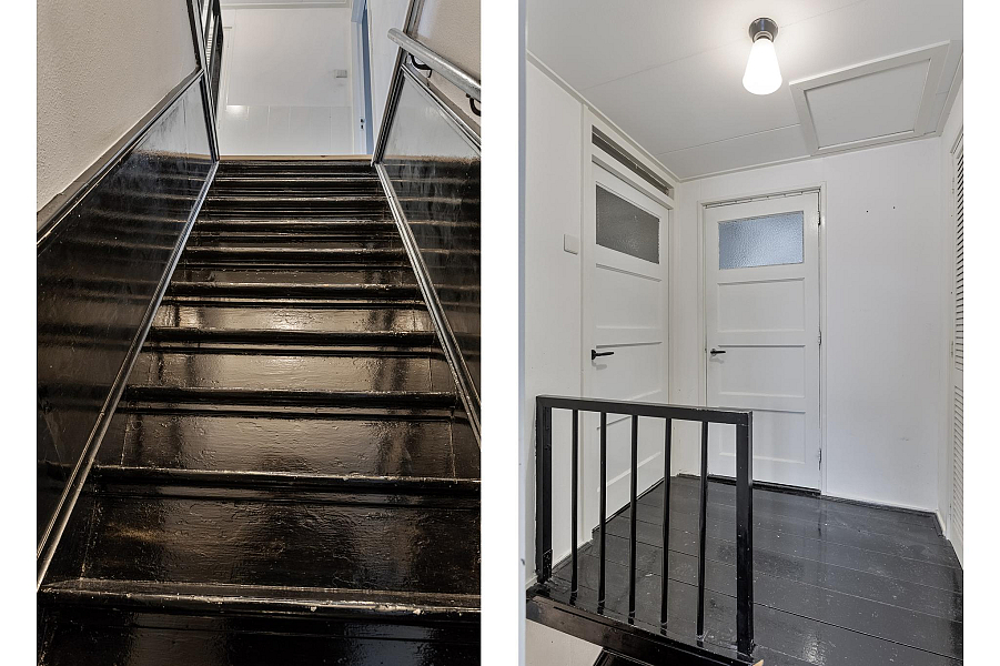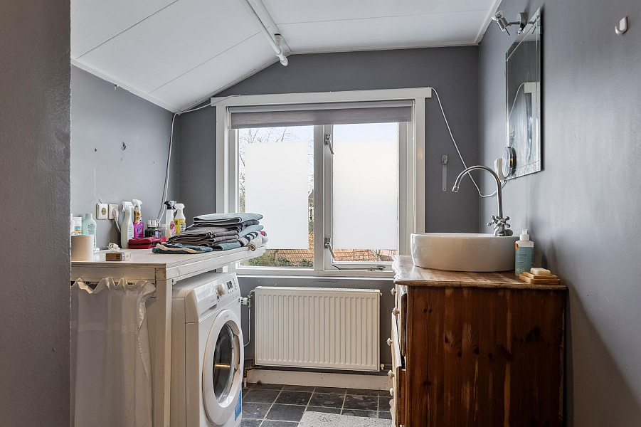 Overloop, 2 slaapkamers (ca. 10 en 8 m2), badkamer met douchehoek, wastafel en wasmachine-aansluiting.