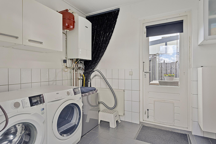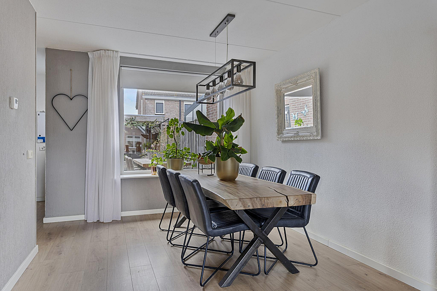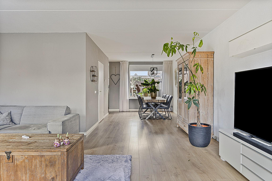BEGANE GROND: Je komt binnen in de hal met nieuw toilet v.v. wandcloset en fonteintje. De ruime L- vormige woonkamer is ruim (40 m²) en licht. De zithoek is straatgericht. De eethoek ligt aan de tuinzijde en biedt plaats aan een flinke eettafel. De open keuken is in 2021 vernieuwd en is v.v. een inductie kookplaat, oven, koelkast, vaatwasser en koffiecorner. Aansluitend is de bijkeuken die is voorzien van aansluitingen voor de wasmachine, droger, cv-ketel (Bosch, bouwjaar 2012) en deur naar de achtergelegen tuin.