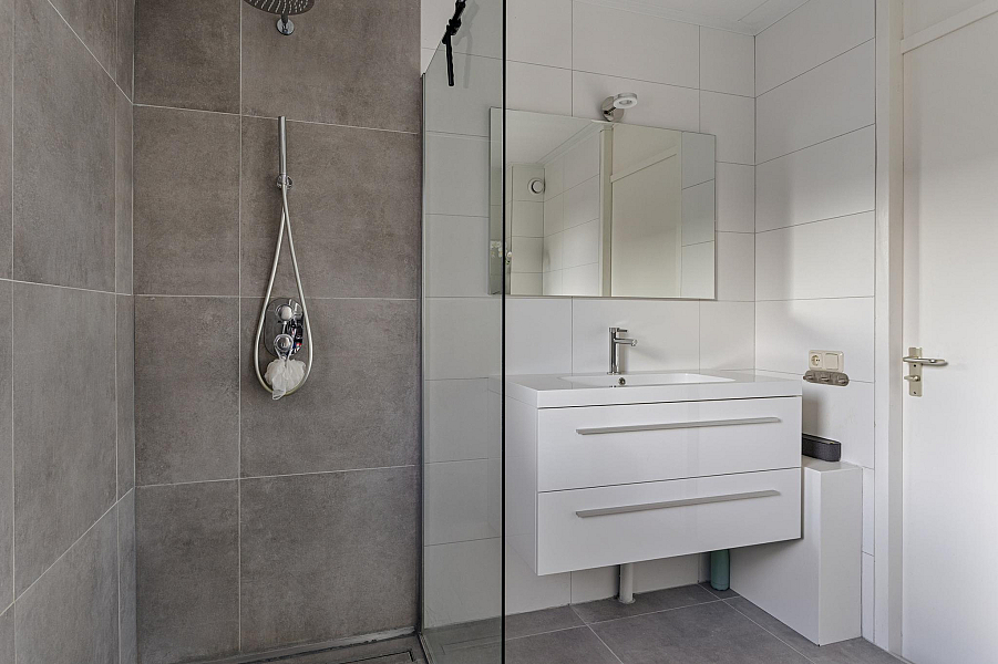 1E VERDIEPING: Overloop, totaal 3 slaapkamers, nieuwe badkamer met inloopdouche, wandcloset en wastafelmeubel, vaste trap naar ...