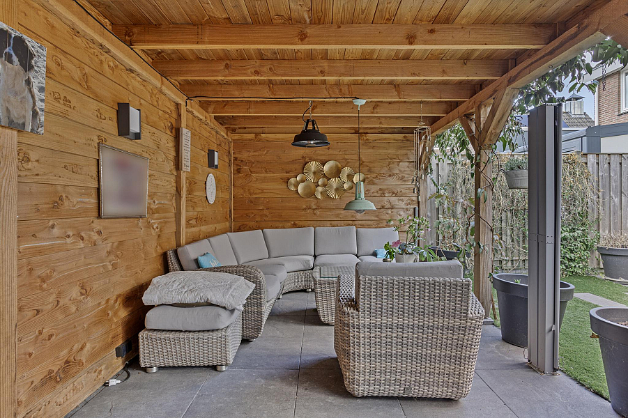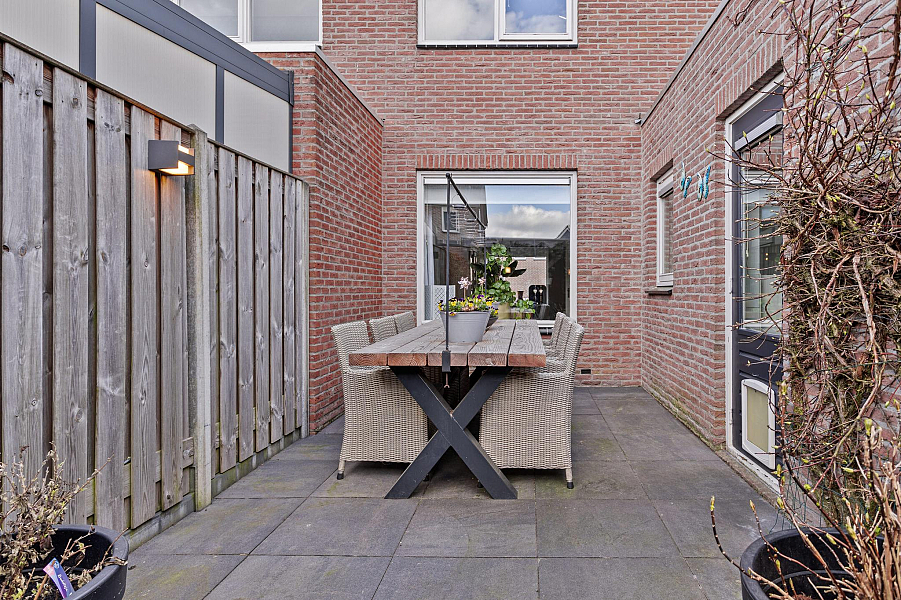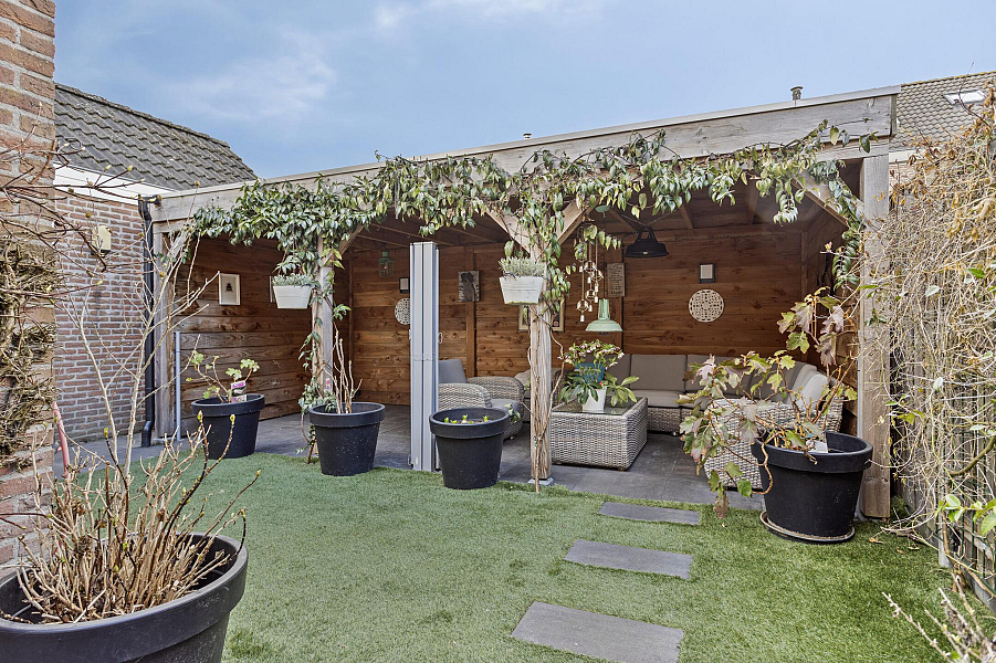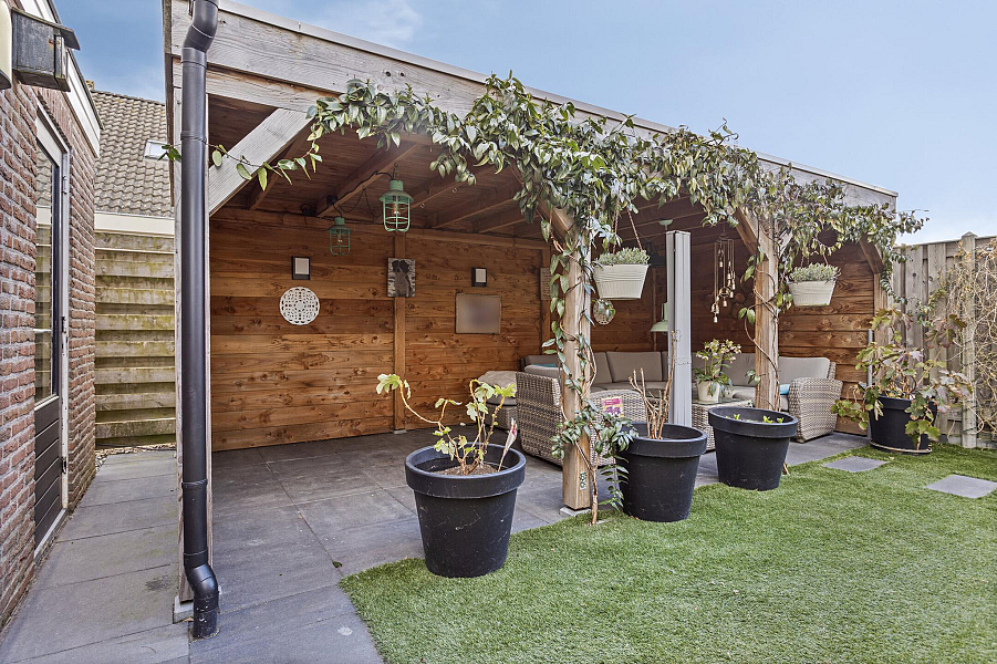 De achtertuin is onderhoudsvrij aangelegd, is ook middels een achterom bereikbaar en is voorzien van een vrijstaande stenen garage en grote overkapping.