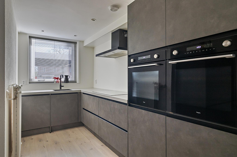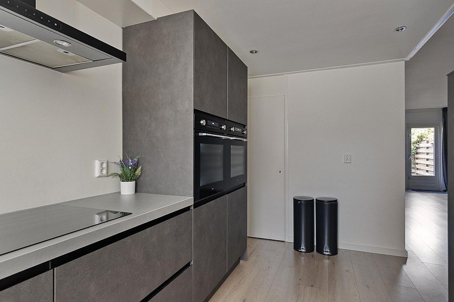 Riante en speelse hal/entree met lichtkoepel, wasruimte en toegang tot het leefgedeelte. De aan de voorzijde gelegen keuken is in 2022 geplaatst en voorzien van een vaatwasser, 5-pits inductiekookplaat, 2 combi ovens/magnetron en een grote koel- vriescombinatie. Tevens heeft u vanuit de keuken toegang tot de trapkast.