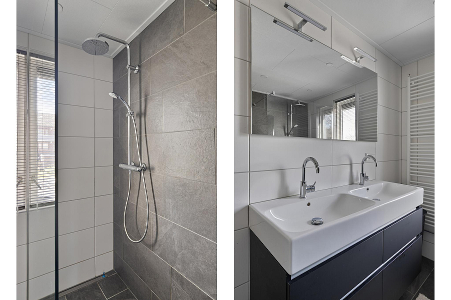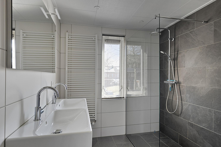 Overloop met toegang tot de drie slaapkamers en de complete badkamer. De badkamer is modern afgewerkt en beschikt over een tweede toilet, inloopdouche, dubbele wastafel en designradiator.