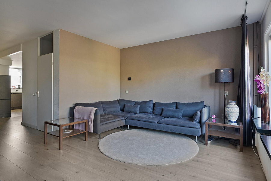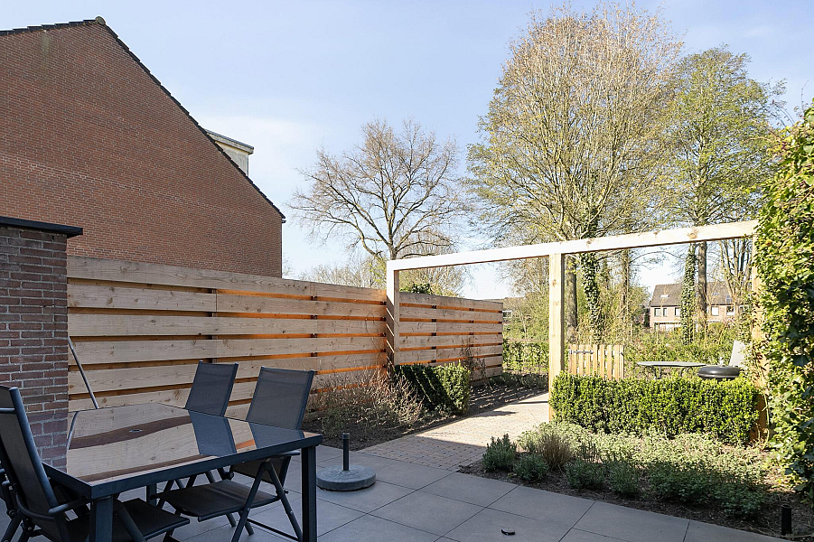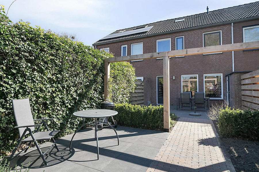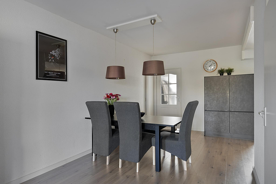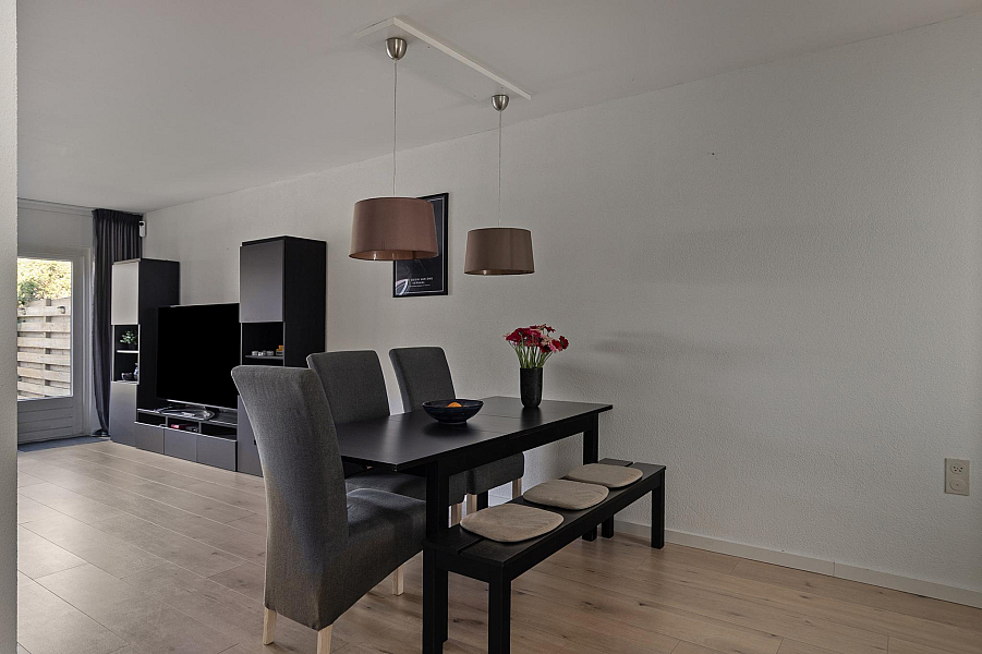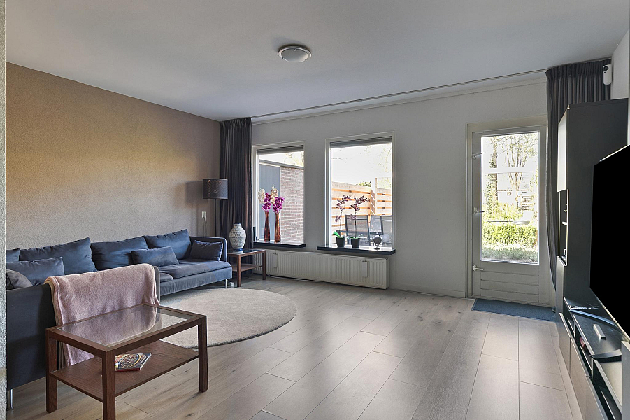 De tuingerichte woonkamer is licht en beschikt over een strakke laminaatvloer. De woonkamer biedt toegang tot de op het westen gelegen tuin. Deze is ingericht met veel groen en terras. Hier kun u de gehele middag, tot het eind van de dag, heerlijk van de zon te genieten.