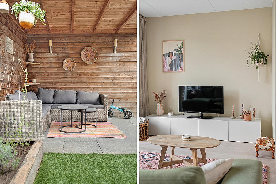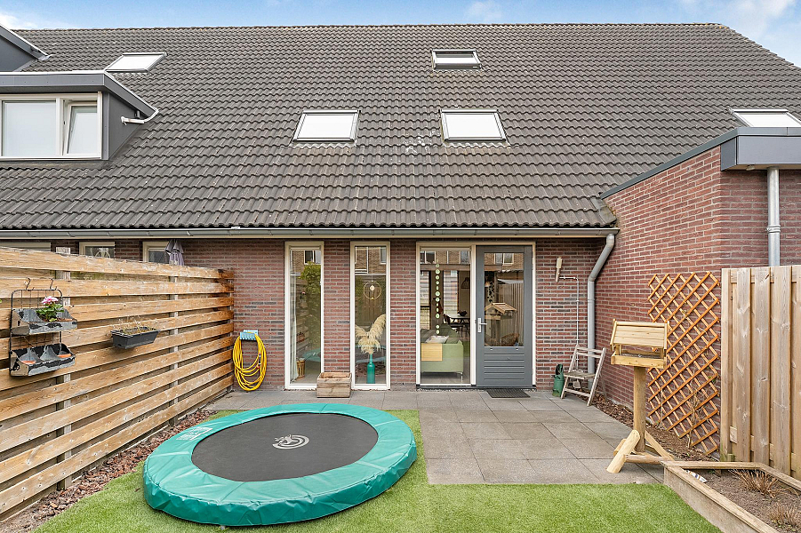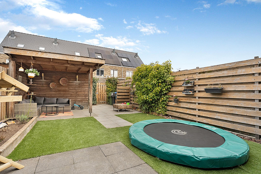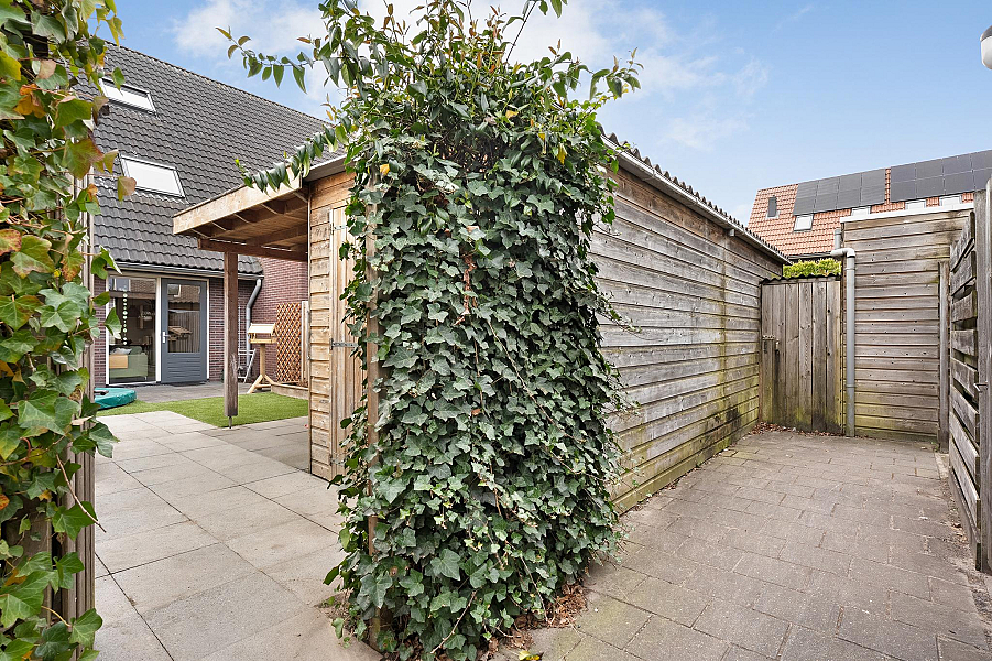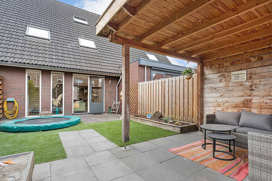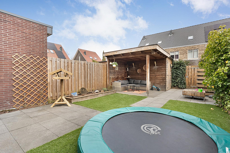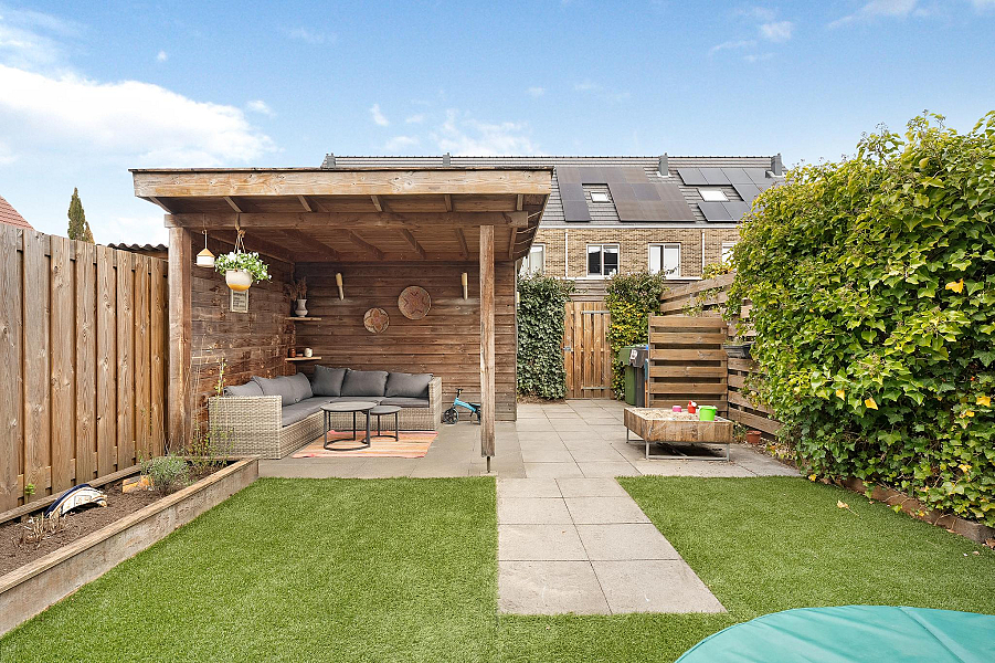 De zonnige achtertuin ligt op het noordwesten, perfect voor middag- en avondzon. Hier vind je een fijne overkapping, terras, onderhoudsvriendelijk kunstgras, een houten berging en een praktische achterom.