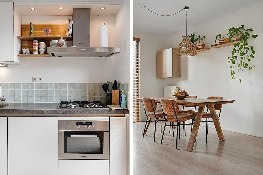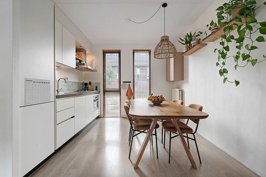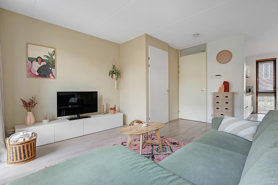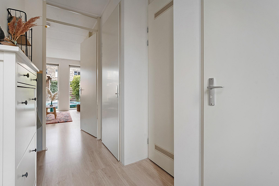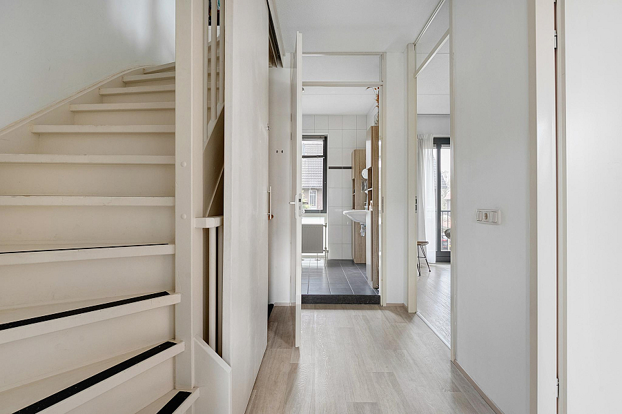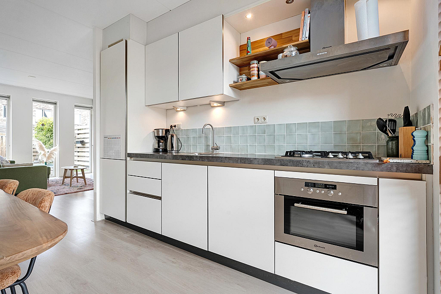 Je komt binnen in de hal met toilet en meterkast. De tuingerichte woonkamer is heerlijk licht dankzij de grote raampartij aan de achterzijde. Aan de voorzijde van de woning bevindt zich de moderne, open keuken, uitgerust met koel-vriescombinatie, oven en een 4-pits gaskookplaat.