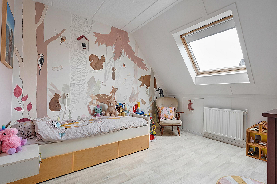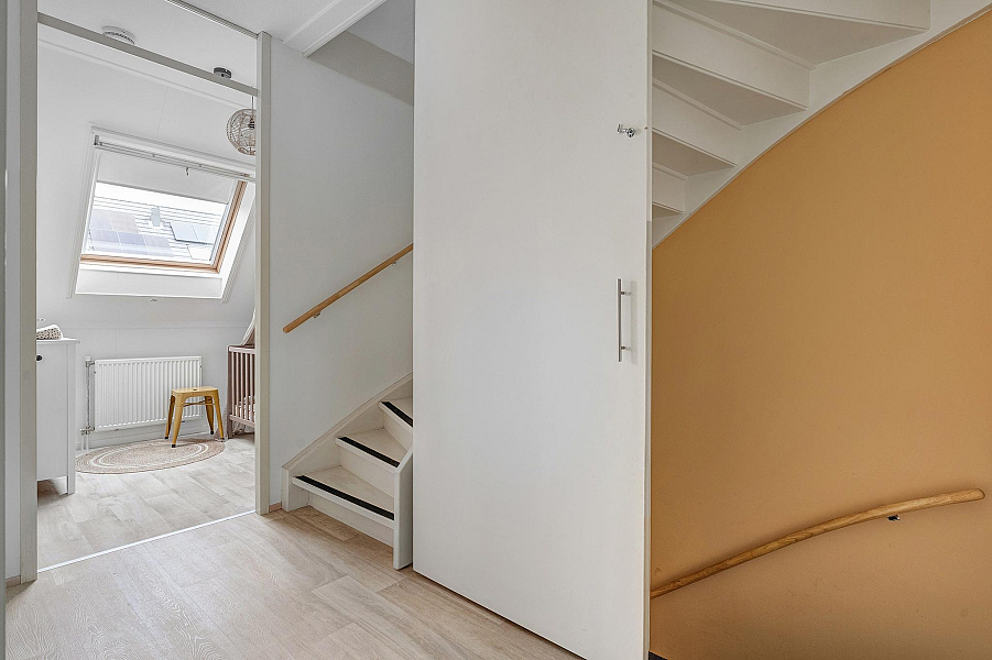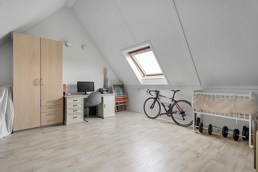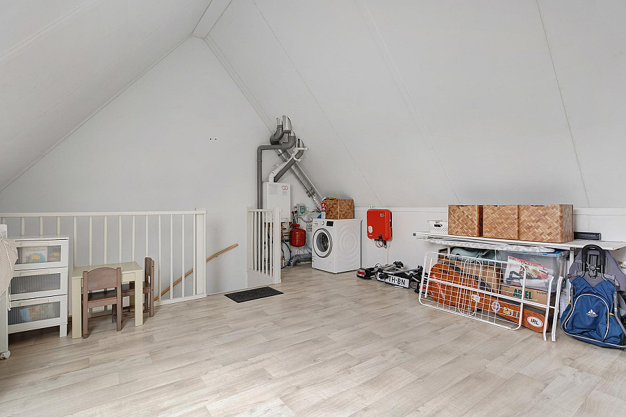 De ruime zolderverdieping is nog een open ruimte, met mogelijkheden om eenvoudig een vierde (slaap)kamer te realiseren. Hier bevinden zich ook de aansluitingen voor wasmachine en droger, de mechanische ventilatiebox en de Intergas HRE CV-ketel.