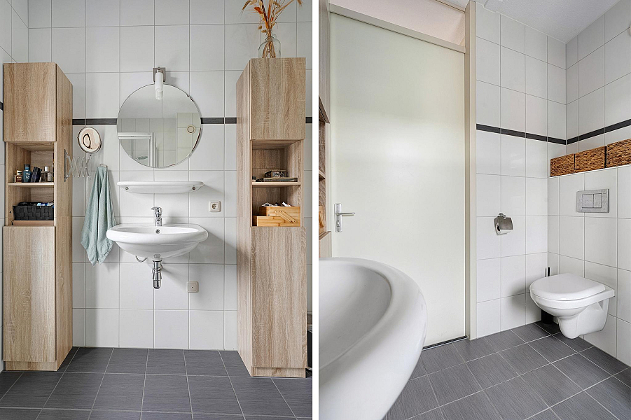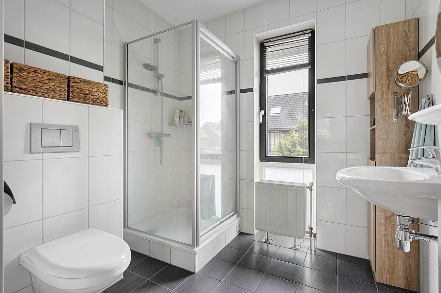Op de eerste verdieping bevinden zich drie slaapkamers en een keurige badkamer voorzien van douche, wastafel en toilet.