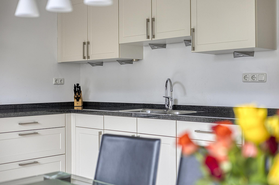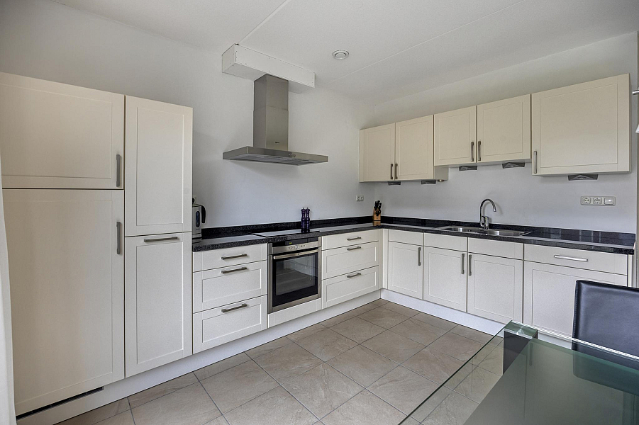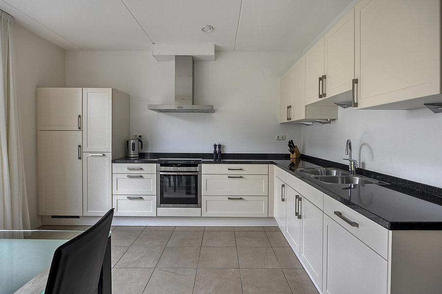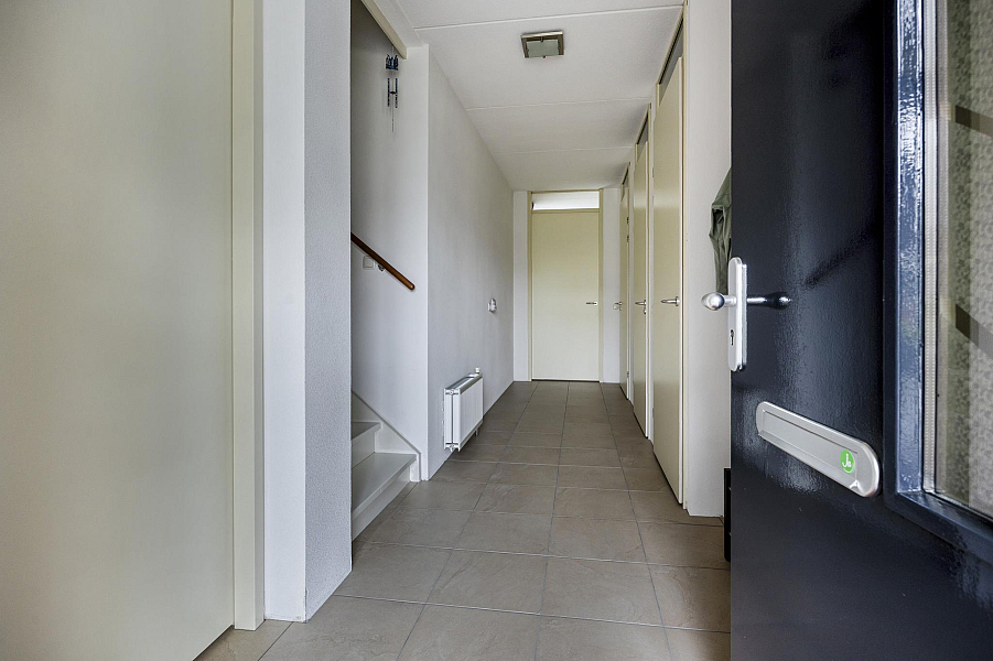 BEGANE GROND: Ruime hal/entree, inpandige berging met opstelplaats voor cv-ketel, wasmachine en droger, straatgerichte woonkamer met plavuizenvloer, praktische provisiekast, uitgebouwde open keuken met schuifpui en luxe keukenopstelling met inbouwapparatuur (o.a. 4-pits inductie kookplaat, afzuigkap, vaatwasser, grote koelkast en oven). Vanuit de hal is ook de uitgebouwde slaapkamer bereikbaar, alsmede de moderne badkamer met vaste wastafel ligbad en douchecabine.