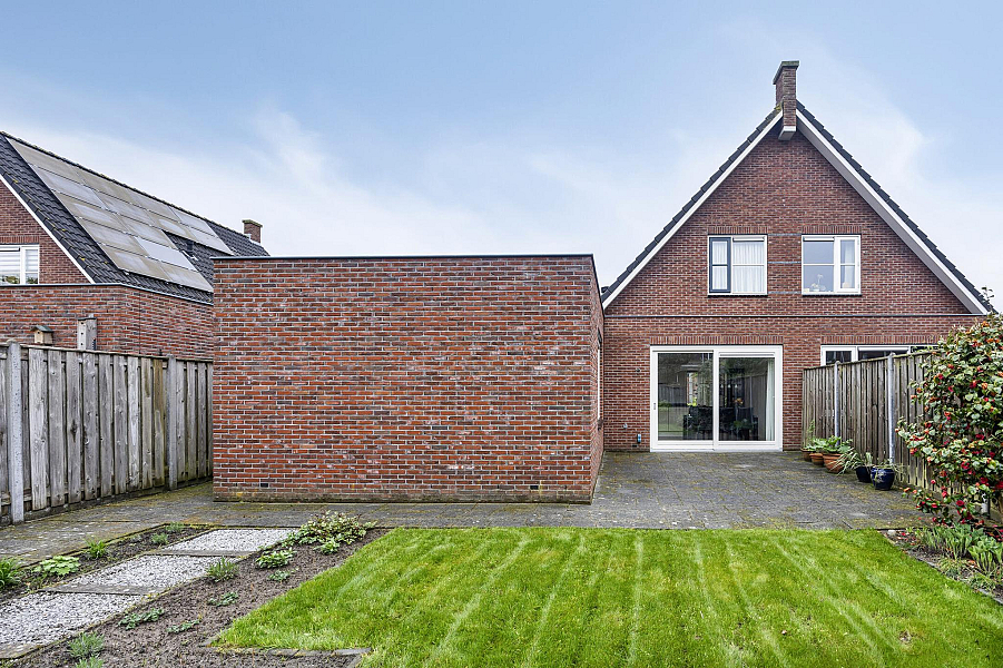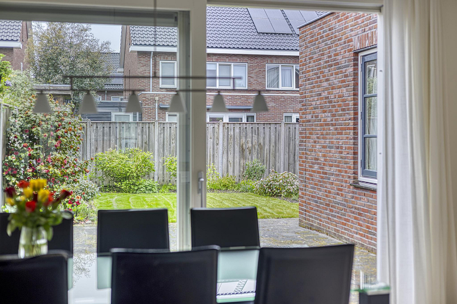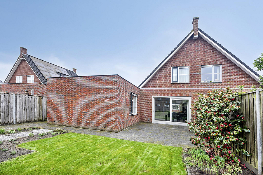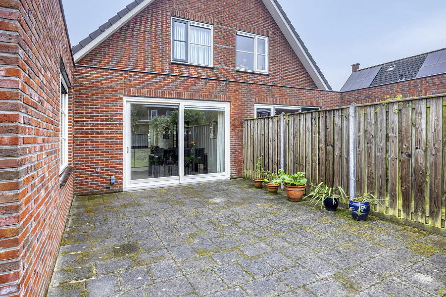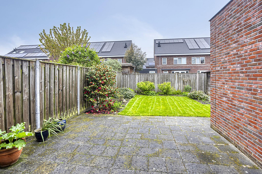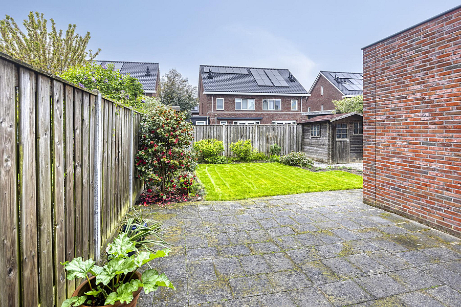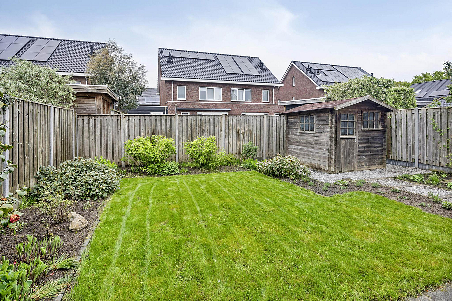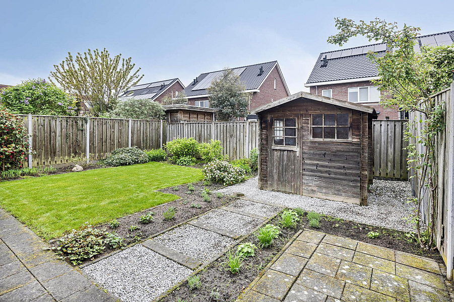 De op het noordwesten gelegen achtertuin is achterom bereikbaar en fraai aangelegd. In de achtertuin bevindt zich nog een vrijstaande houten schuur.