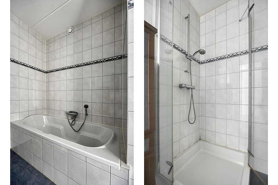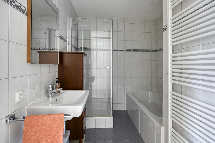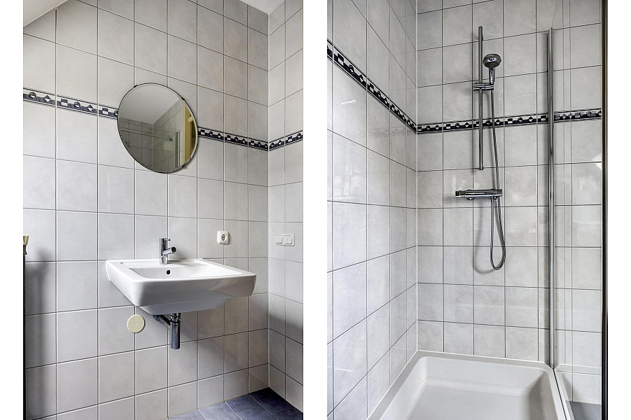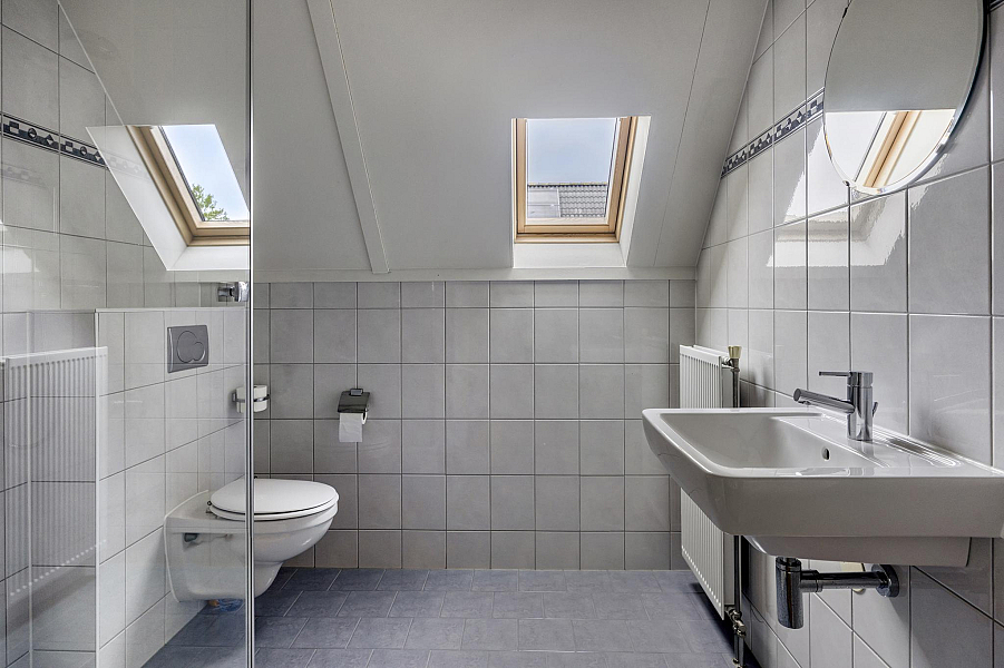 1E VERDIEPING: Overloop, 2 ruime slaapkamers van 10 en 12,5 m2 met laminaatvloer, ook hier een moderne badkamer met inloopdouche, wandcloset en wastafel, middels een vlizotrap naar ...