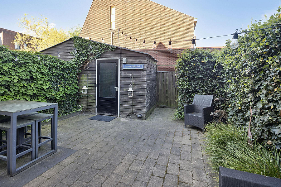 De op het zuidwesten gelegen achtertuin is voorzien van een vrijstaande houten berging en is ook middels een achterom bereikbaar.