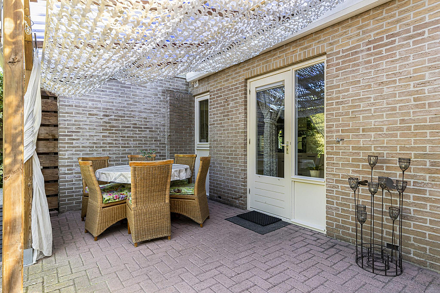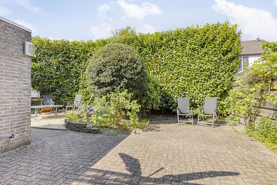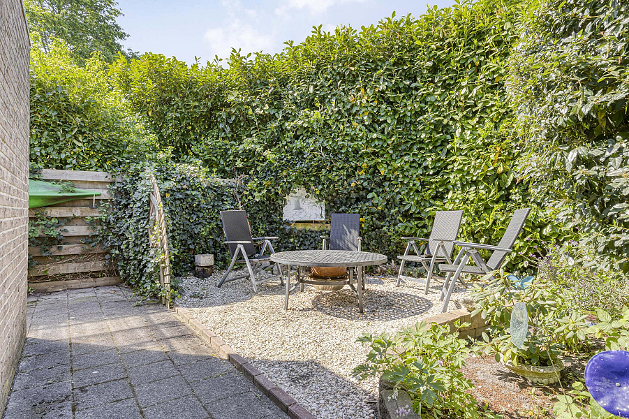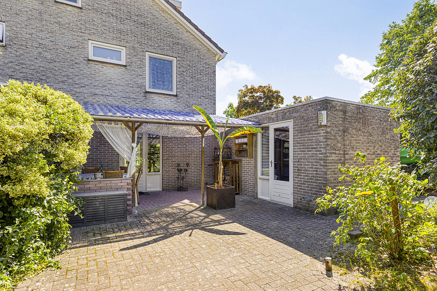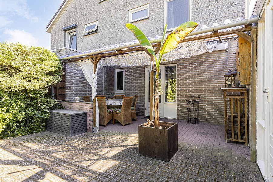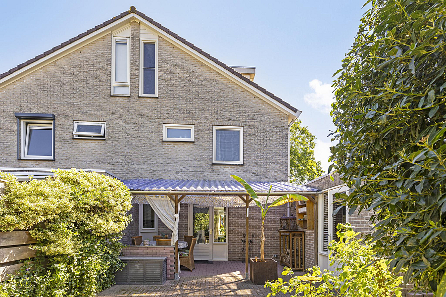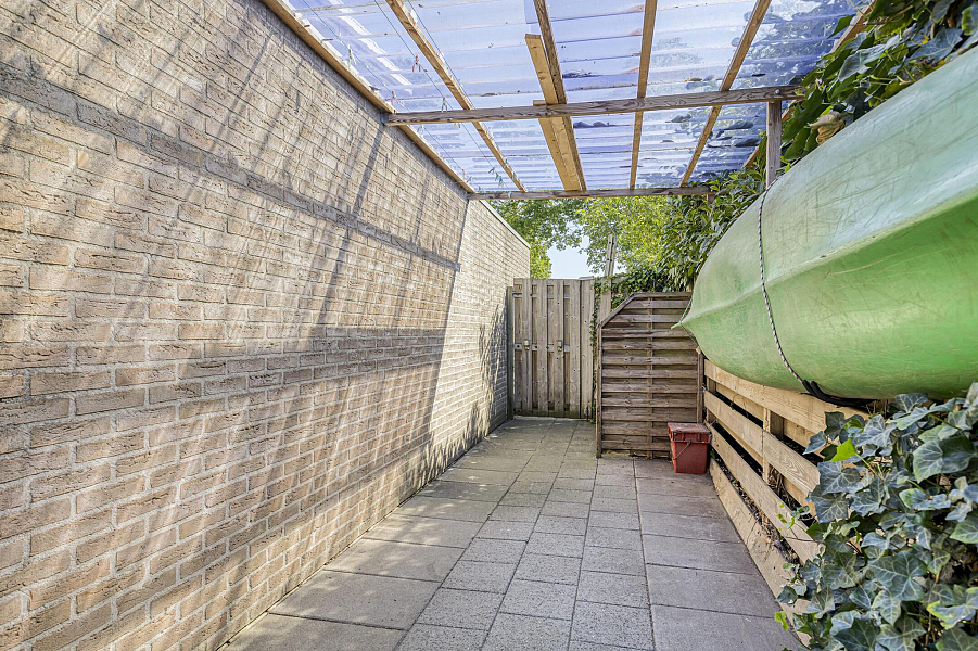 Aan de achterzijde van de woning is een overkapping gerealiseerd, waar het heerlijk vertoeven is. De tuin biedt meerdere zithoekjes en is ook middels een brede achterom bereikbaar.