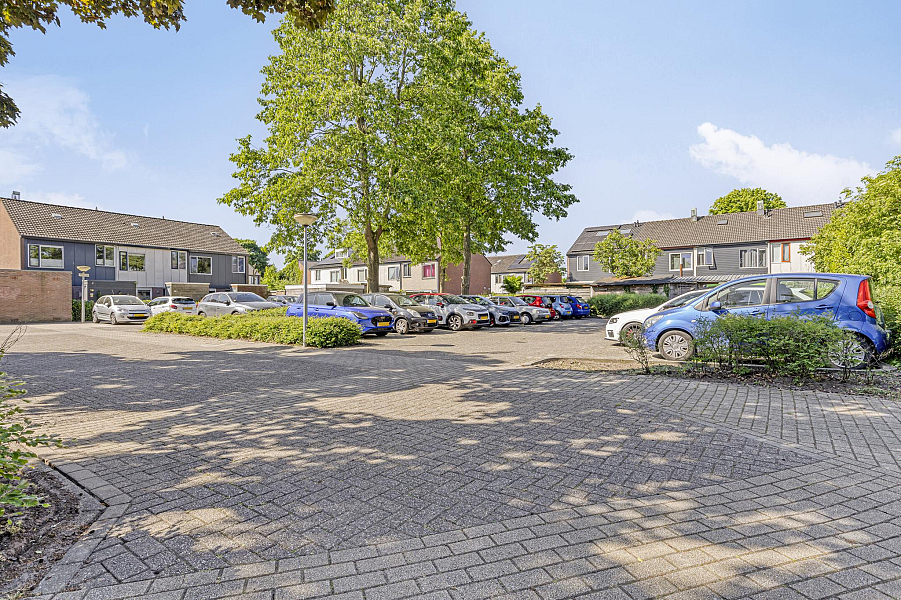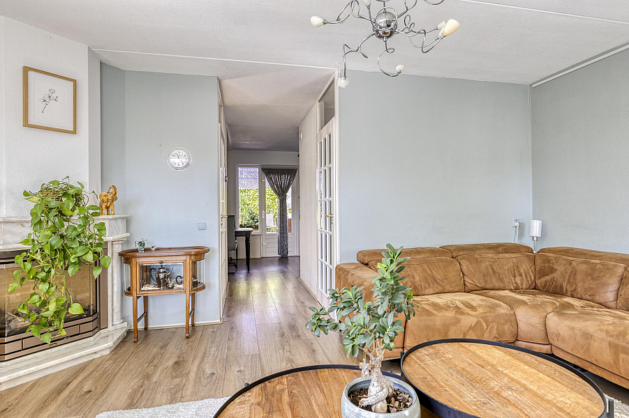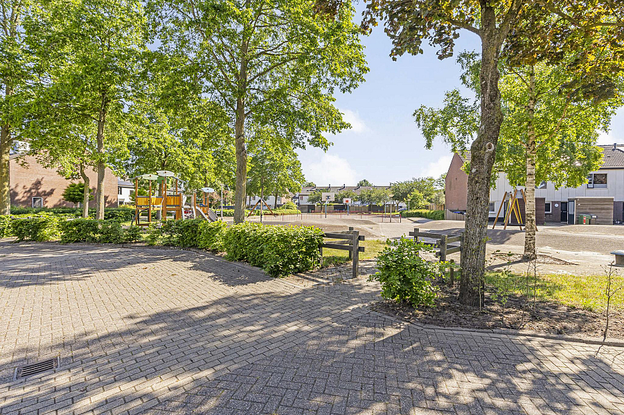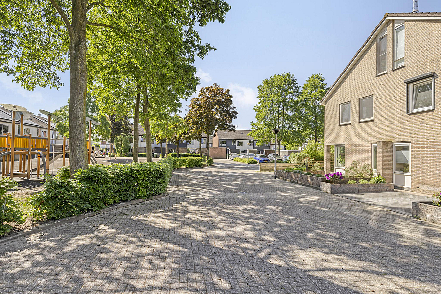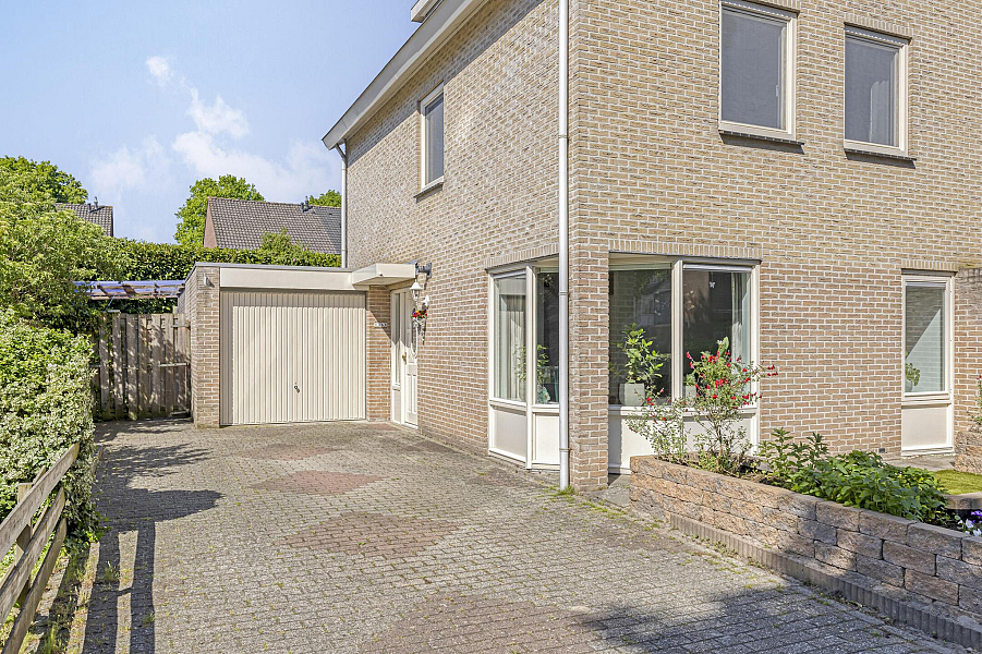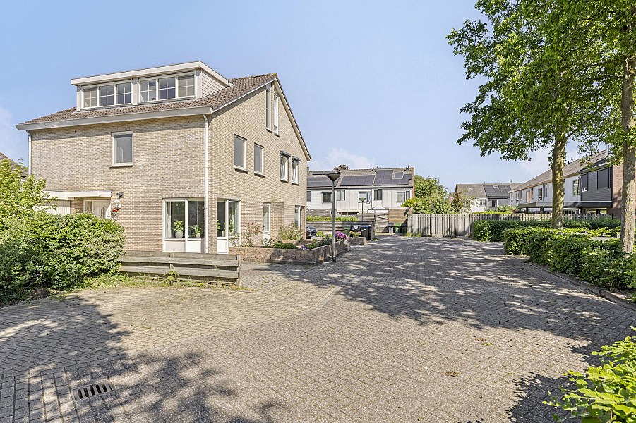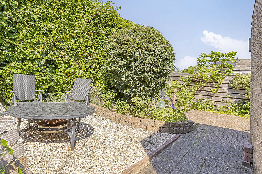 Aan de achterzijde van de woning is een overkapping gerealiseerd, waar het heerlijk vertoeven is. De tuin biedt meerdere zithoekjes en is ook middels een brede achterom bereikbaar.