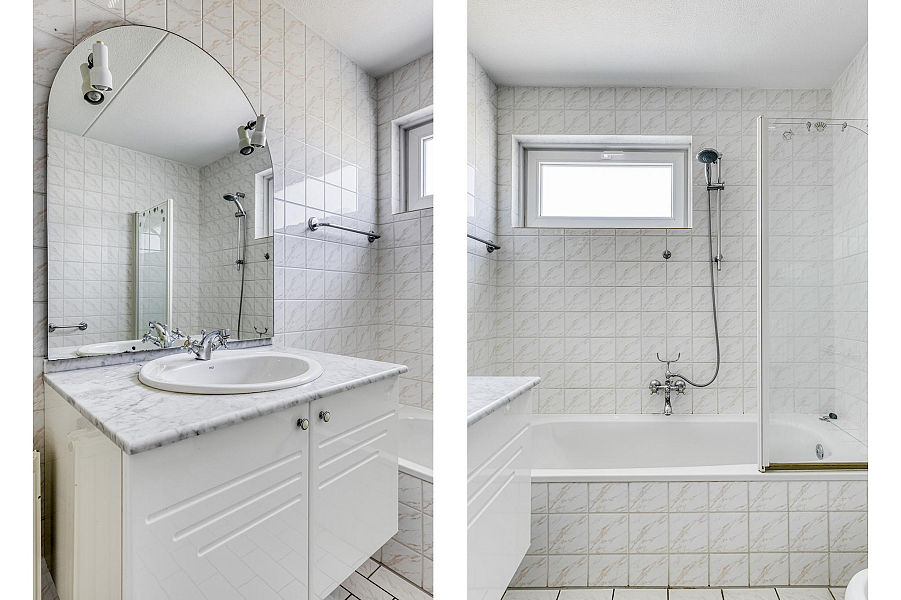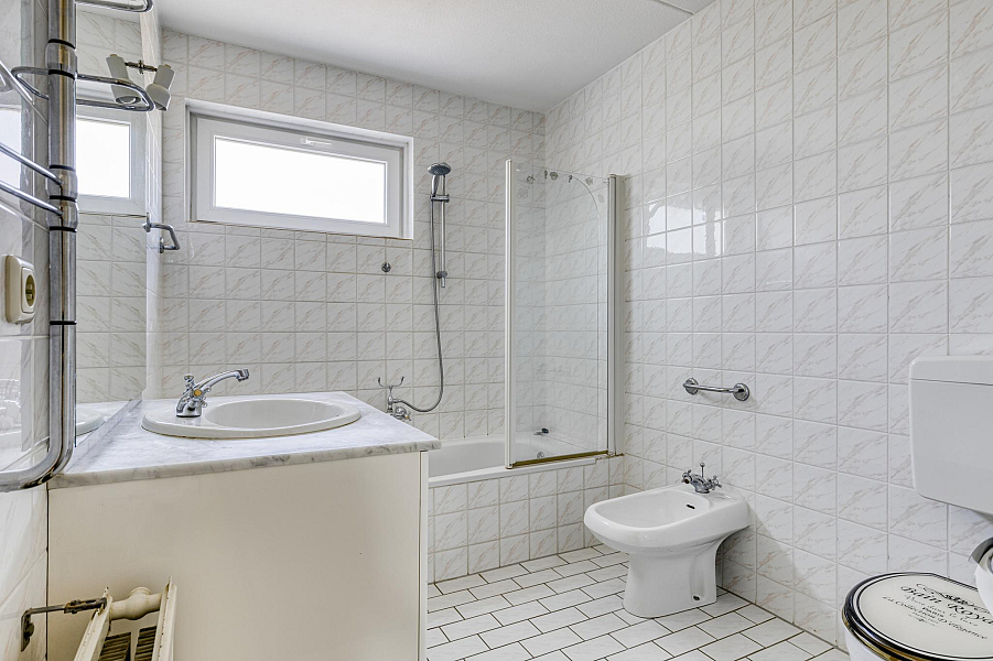 Overloop, 2 slaapkamers van circa 11m2 en 22 m2, waarbij de grootste slaapkamer vrij eenvoudig weer gesplitst kan worden zodat er totaal 3 slaapkamers mogelijk zijn, badkamer met ligbad, wastafelmeubel, toilet en bidet, vaste trap naar ...