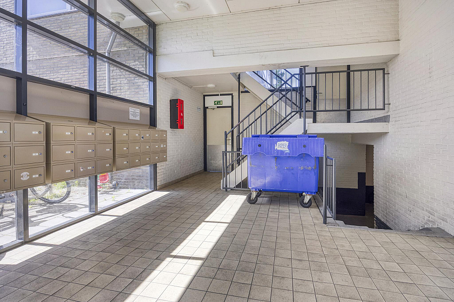 Centrale entree met trappenhuis en toegang tot bergingen en gezamenlijke fietsenstalling.