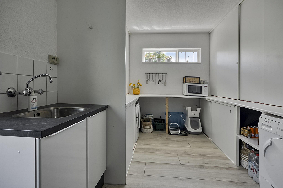 Fraaie hal met garderobehoek, toilet met wandcloset en fonteintje, zonnige tuingerichte woonkamer met open haard en schuifpui, welke toegang biedt tot de prachtige tuin. Aansluitend is de half open keuken gesitueerd, welke is ingericht met een kookeiland. Uiteraard is deze keuken v.v. alle denkbare apparatuur, zoals een combi oven, vaatwasser, inductie kookplaat met afzuiging, koelkast en quooker. Aansluitend is de eetkamer met tuindeuren, welke eveneens gesitueerd is aan de tuinzijde. Via de zij entree en keuken is een ruime berging/bijkeuken bereikbaar. De gehele begane grond is voorzien van keramische tegels (houtmotief) met vloerverwarming.