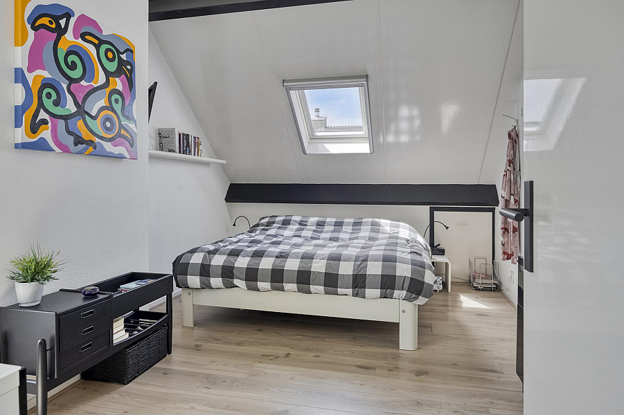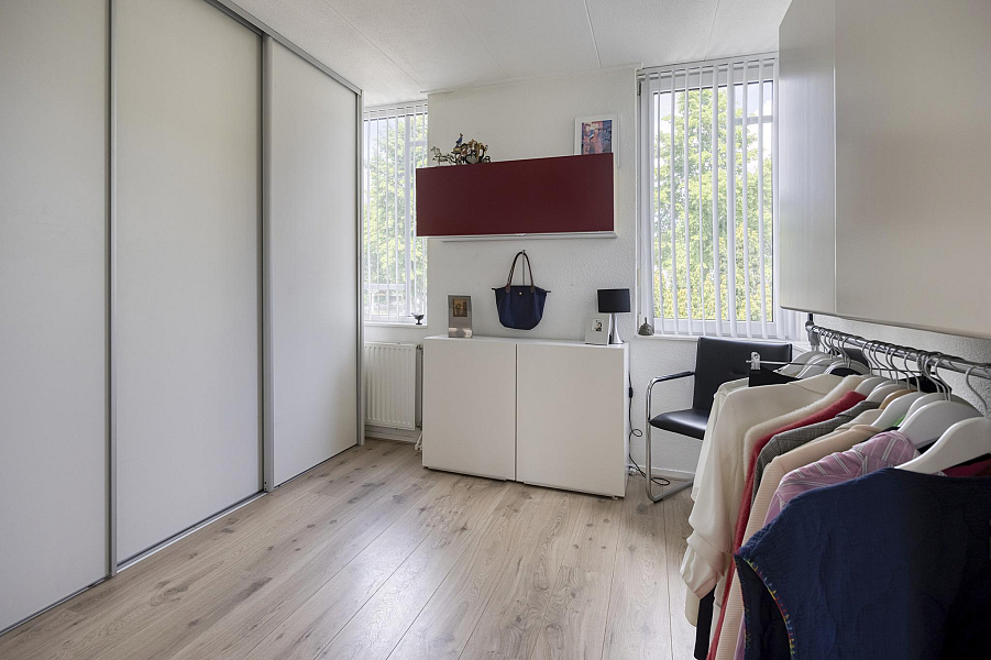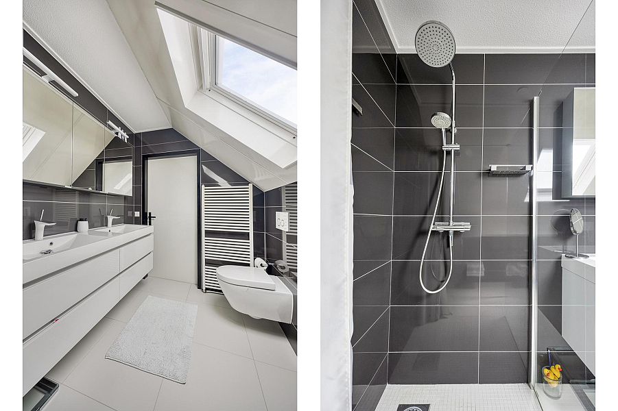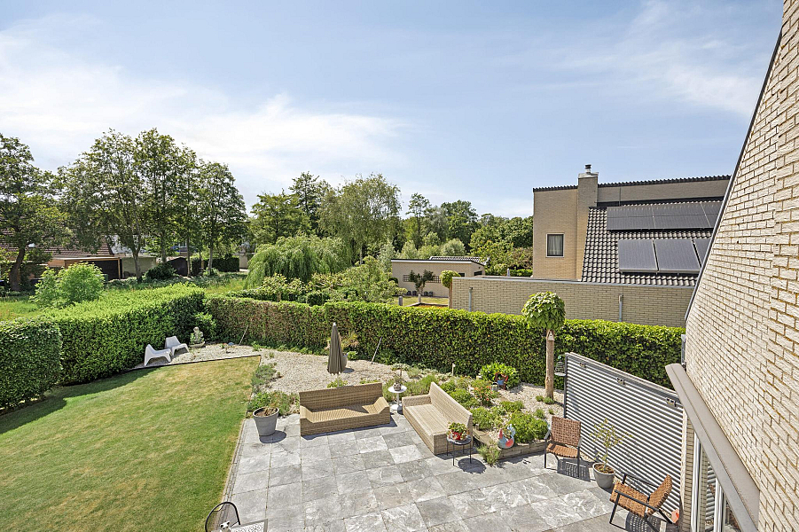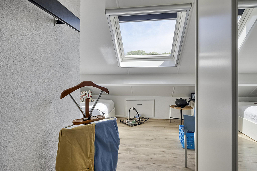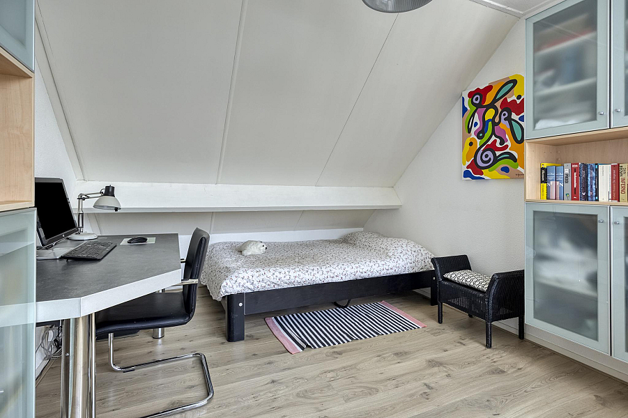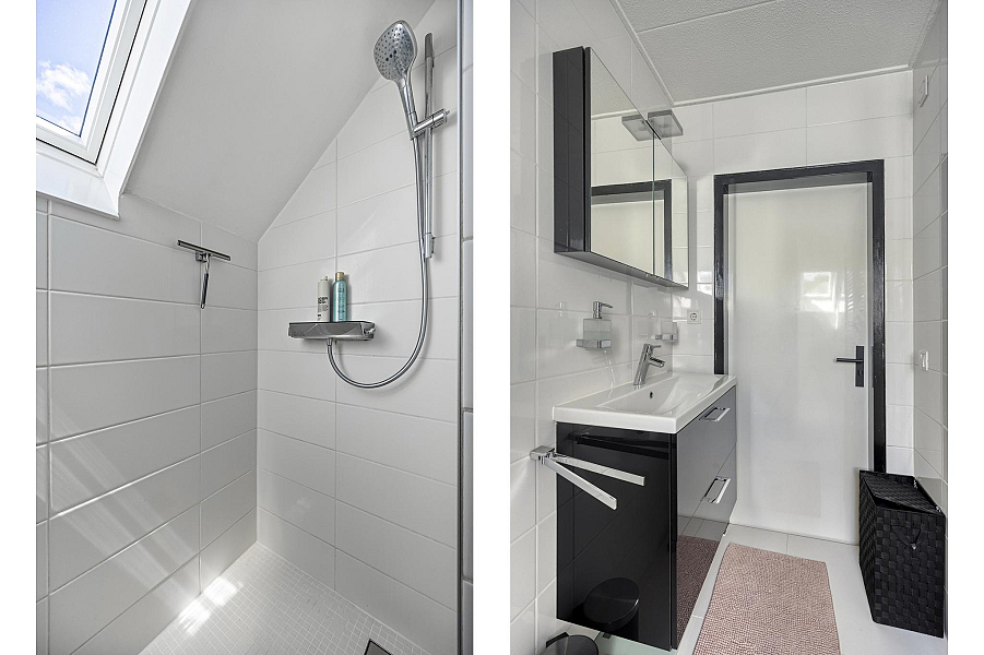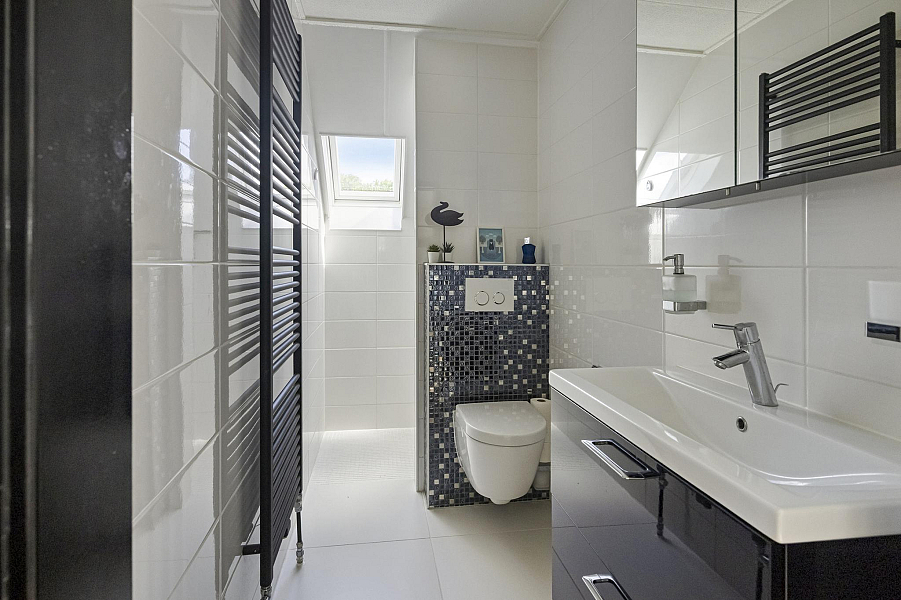 Speelse overloop met pui naar het dakterras, 4 prima slaapkamers met veel kastruimte, 2 badkamers, waarvan de eerste badkamer is v.v. een inloopdouche, toilet en dubbele wastafel en de gastenbadkamer met douche, toilet, en wastafelmeubel. Beide badkamers zijn v.v. vloerverwarming.