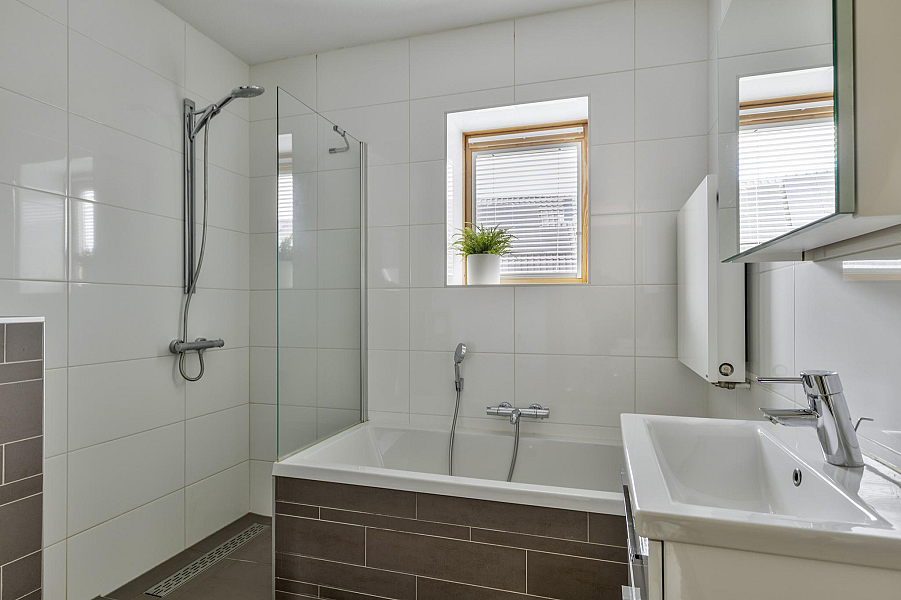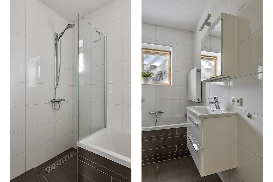 Op de eerste verdieping bevinden zich drie ruime slaapkamers, waarvan de twee aan de achterzijde zijn uitgerust met een dakraam inclusief hor en rolgordijn. De complete badkamer is voorzien van een ligbad, douche, wastafel en een tweede toilet.