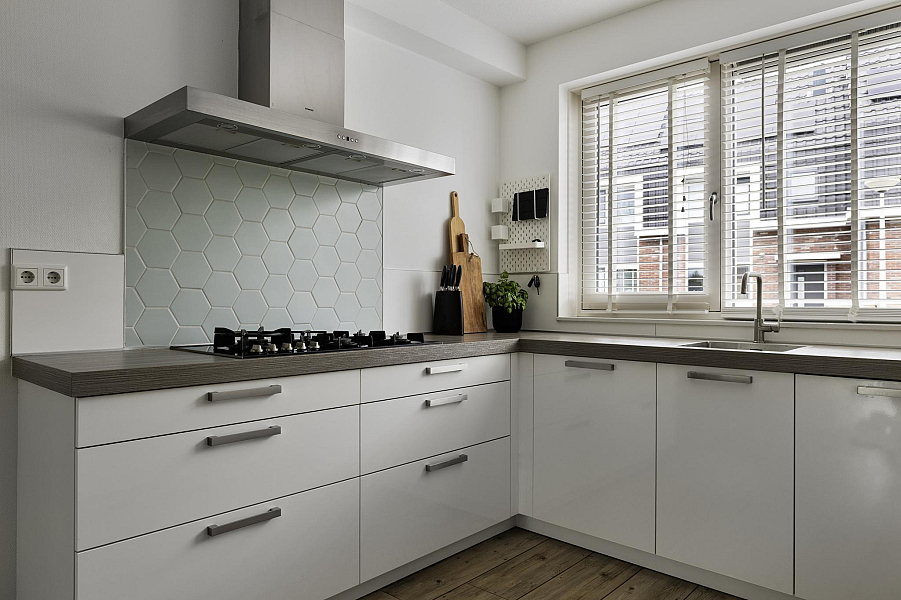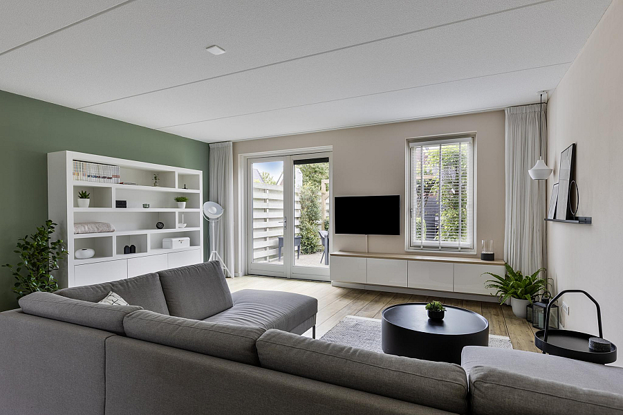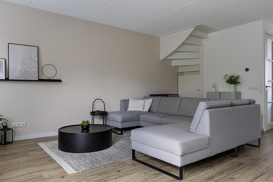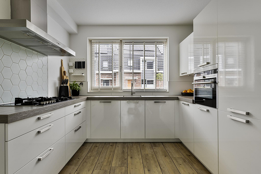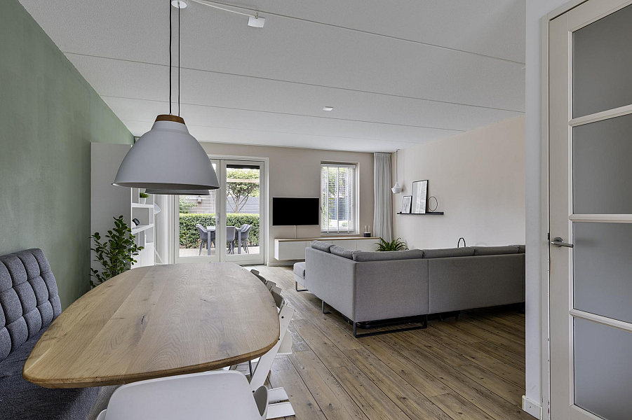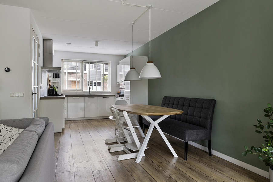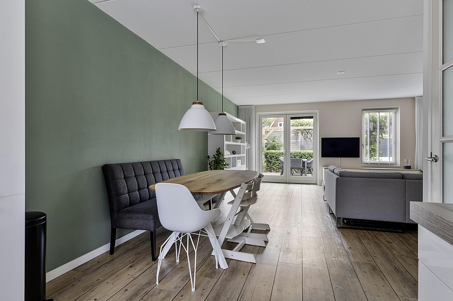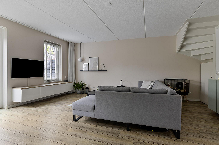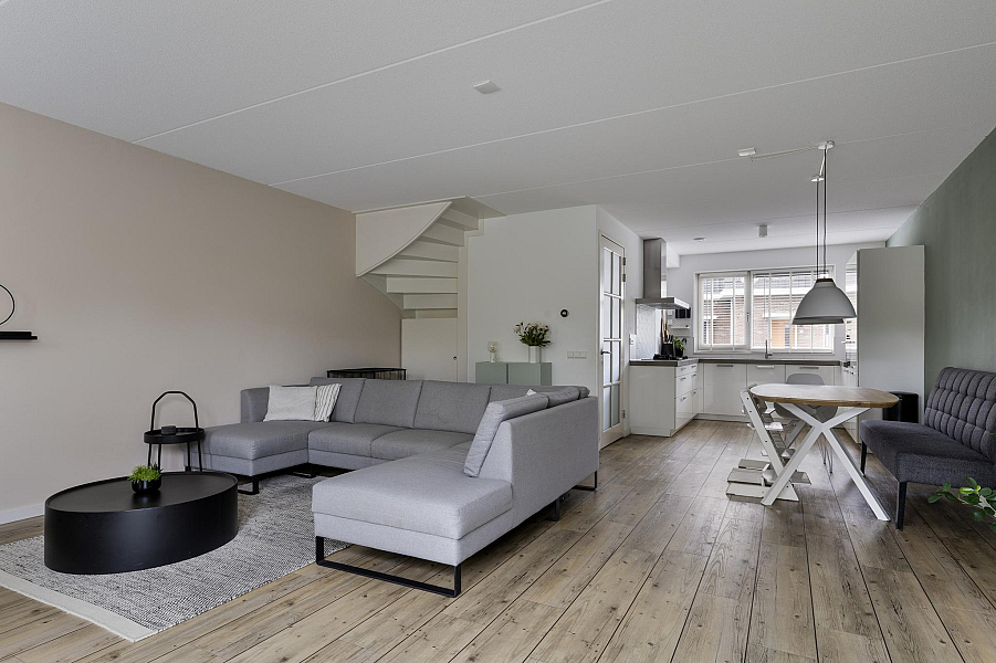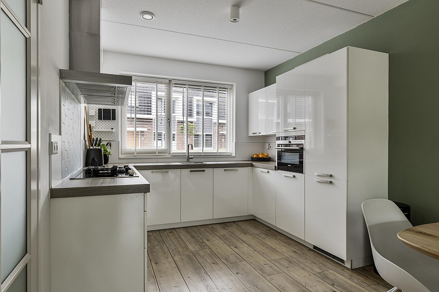 Bij binnenkomst tref je een nette hal met toegang tot het toilet en de lichte, met 1,20 meter uitgebouwde woonkamer. De woonkamer is heerlijk ruim, beschikt over een praktische trapkast en biedt direct toegang tot de zonnige achtertuin. De open keuken aan de voorzijde is van alle gemakken voorzien, waaronder een koel-vriescombinatie, vaatwasser, 5-pits gasfornuis, combioven en een afzuigkap met directe doorvoer naar buiten. De gehele begane grond is voorzien van vloerverwarming, wat zorgt voor extra wooncomfort.