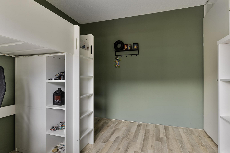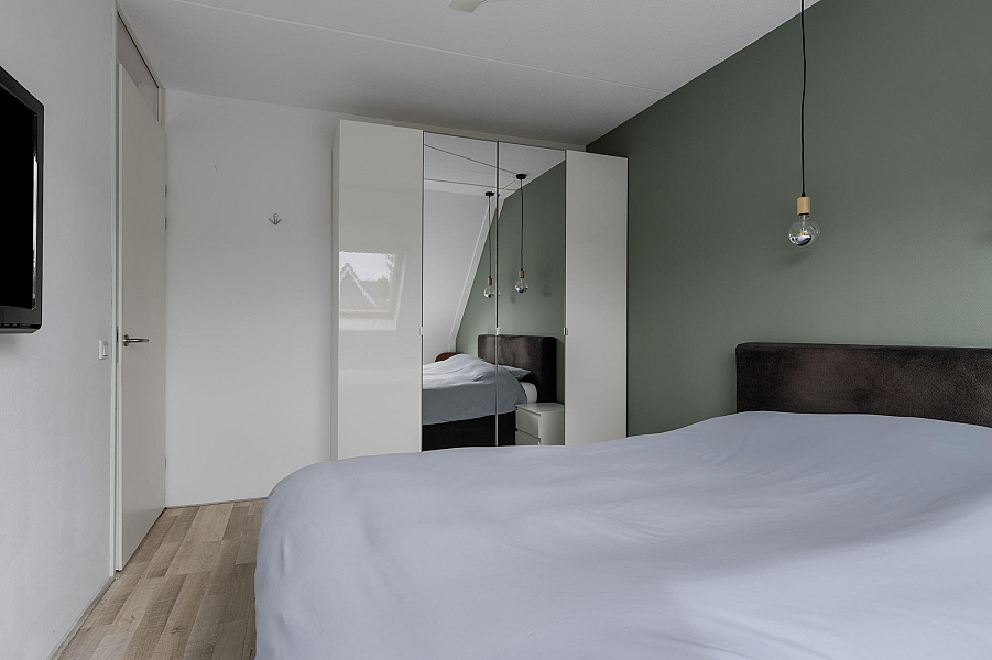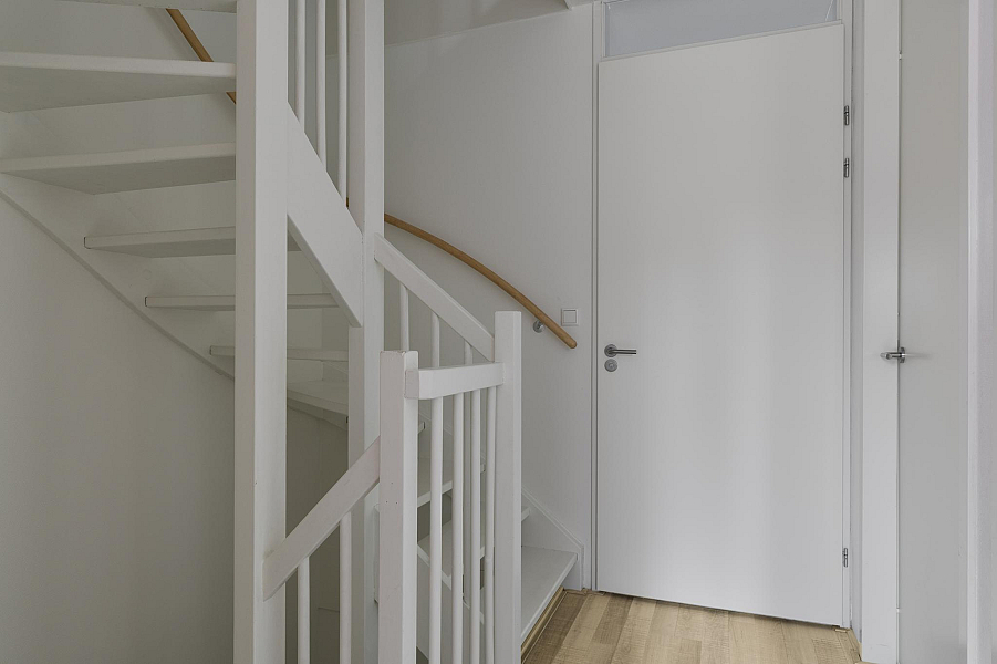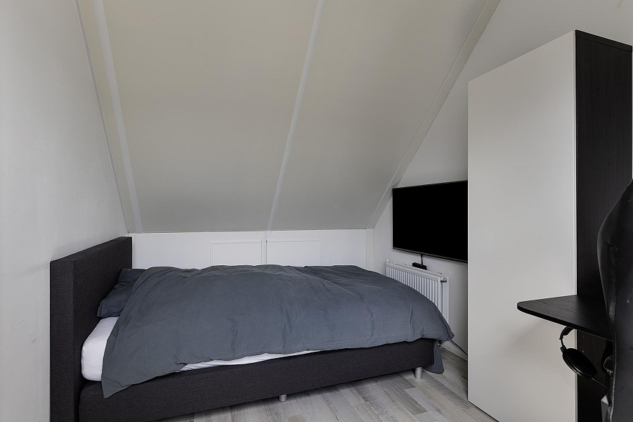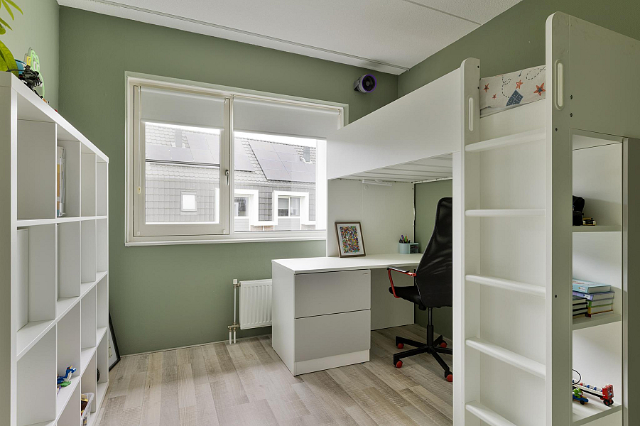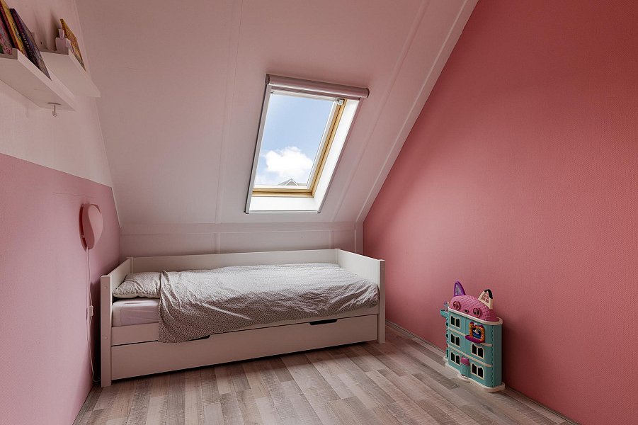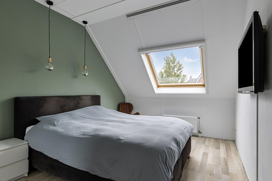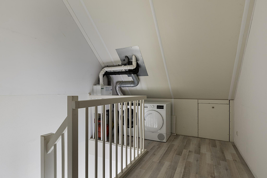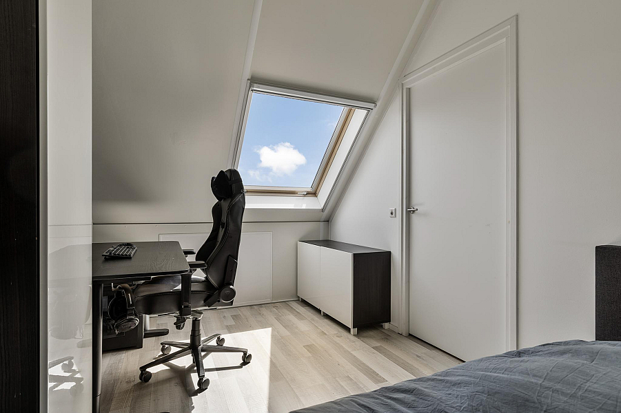 De tweede verdieping biedt nog een verrassend ruime vierde slaapkamer, eveneens met dakraam, hor en rolgordijn. Op de voorzolder vind je de CV-ketel, ventilatiebox en de aansluitingen voor wasmachine en droger. Ook is er voldoende bergruimte aanwezig.
