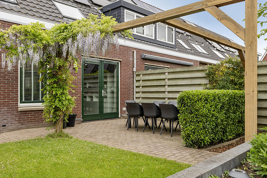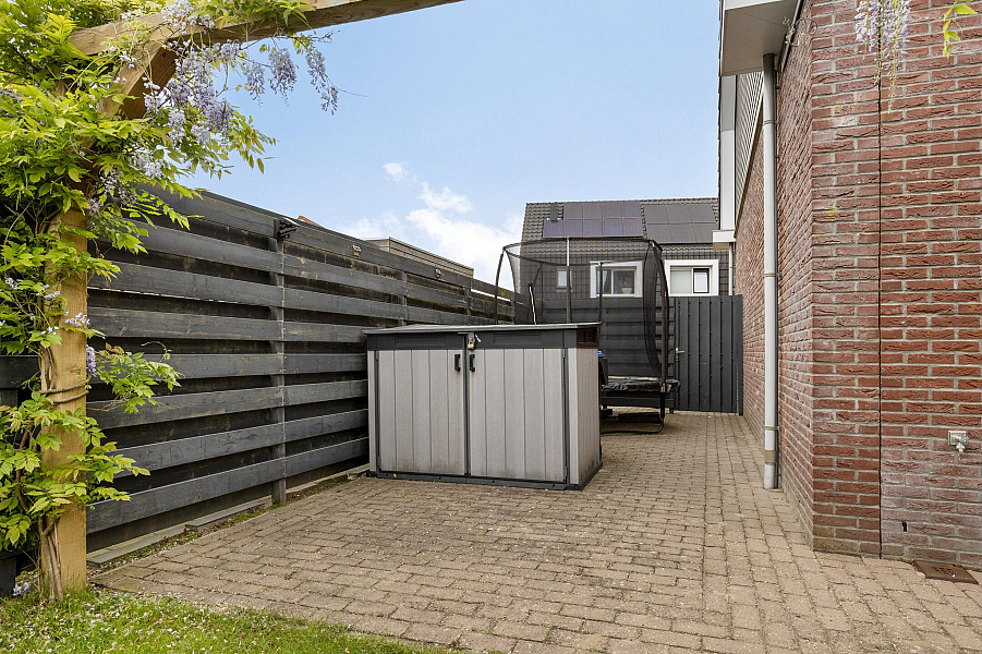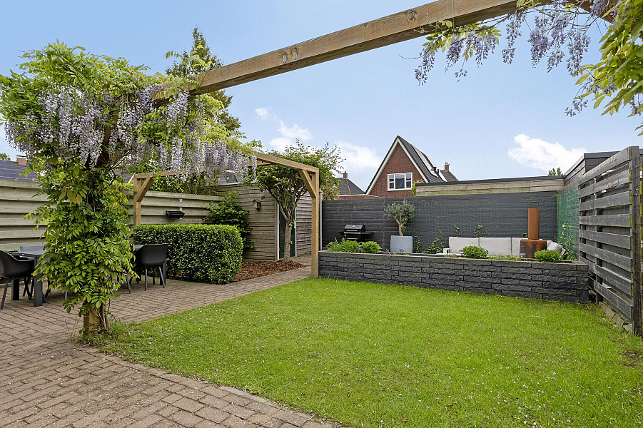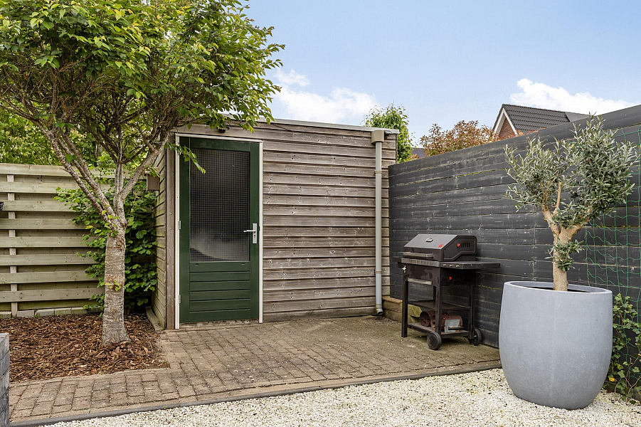De verzorgde tuin op het zuidoosten is een heerlijke plek om te ontspannen. Dankzij de vrije ligging geniet je hier volop van de zon. De tuin beschikt over een vrijstaande houten berging, een buitenkraan en een achterom. Parkeren doe je gemakkelijk op je eigen oprit, waar plek is voor twee auto’s.