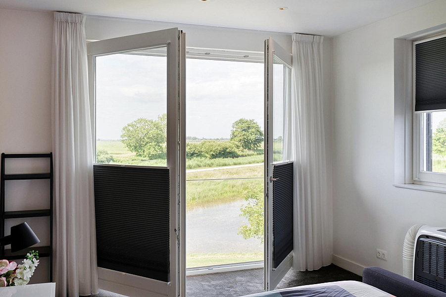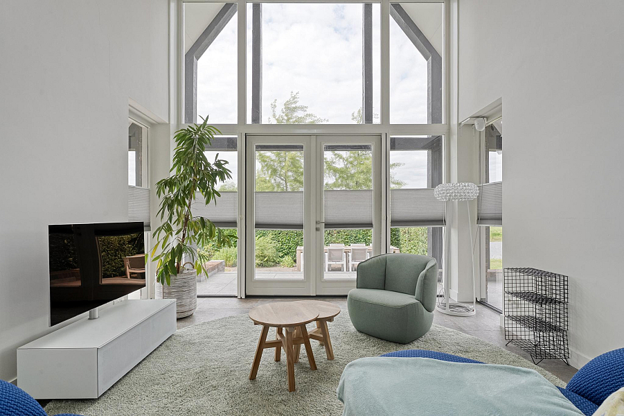 Screens en zonneschermen op alle ramen aan de achterzijde voor optimaal comfort en privacy;