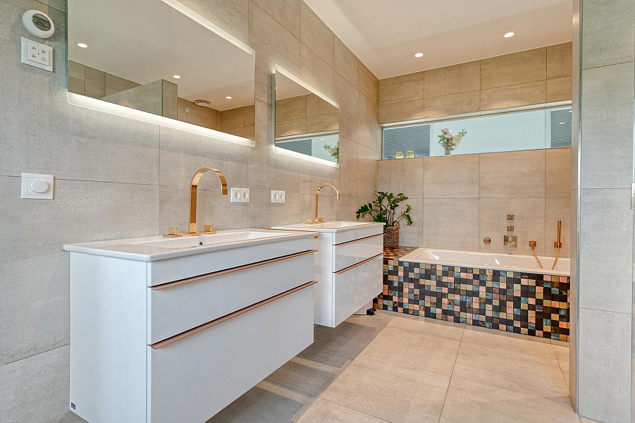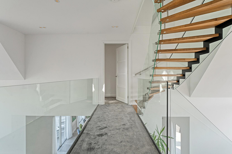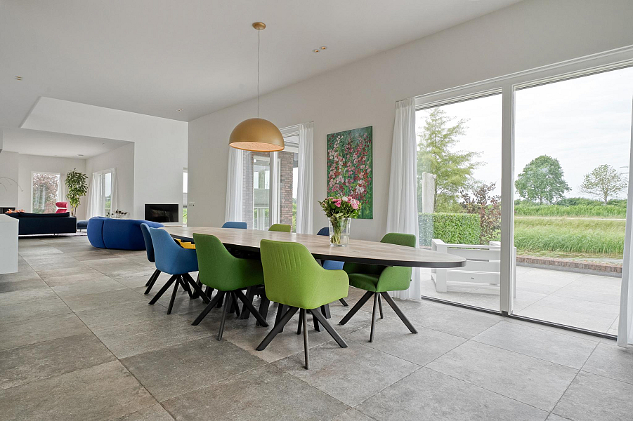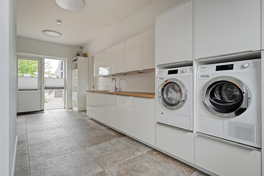 Begane grond: imposante entree met vide en fraaie trapopgang naar de verdieping, garderobekast en toilet, royale speelse living met zitkamer met gashaard en tuindeuren naar het grote terras, speelkamer, luxe moderne open keuken met kookeiland en alle inbouwapparatuur (2 Bora inductiekookplaten met afzuiging, 2 vaatwassers, combi stoomoven, combi magnetron, grote koelkast, wijnklimaatkast, vrieskast en een Quooker, kantoor, praktische bijkeuken met witgoed aansluitingen en keukenblok, toilet met fontein en deur naar de inpandige volledig geïsoleerde en verwarmde dubbele garage v.v. elektrische deuropeners.