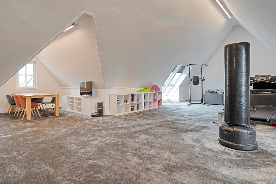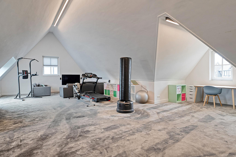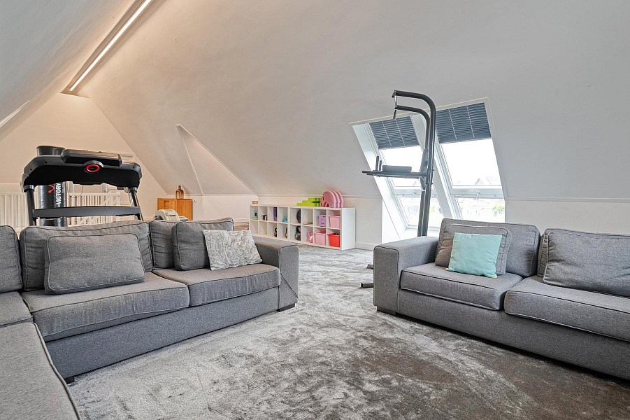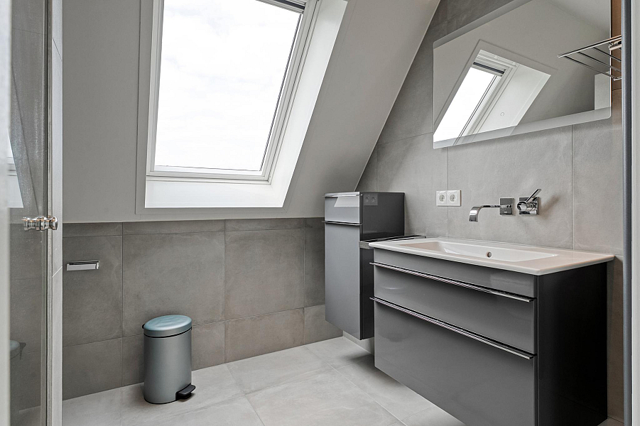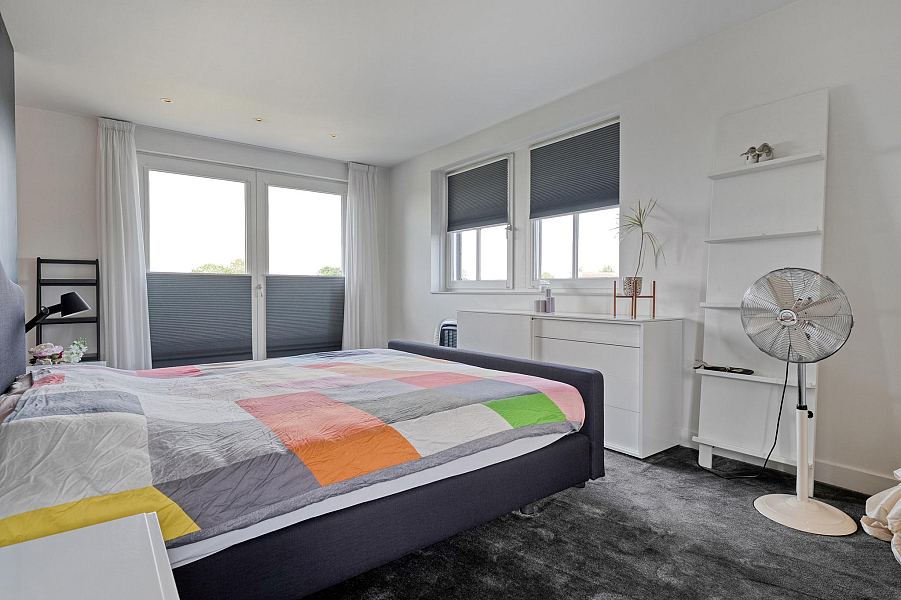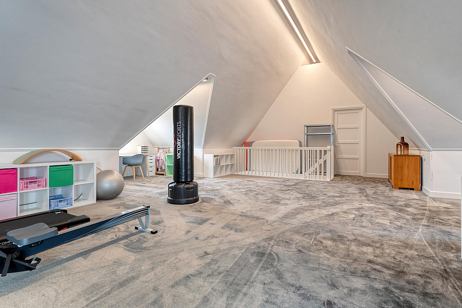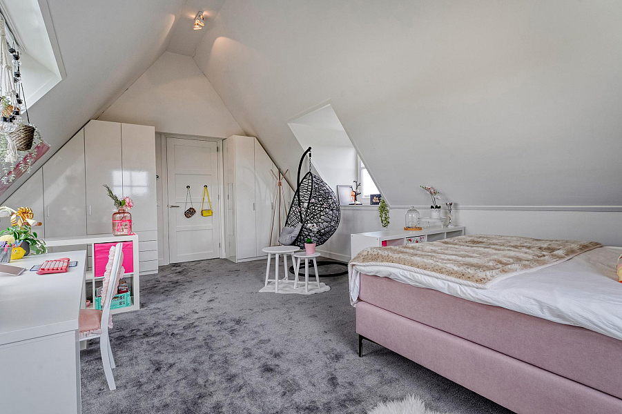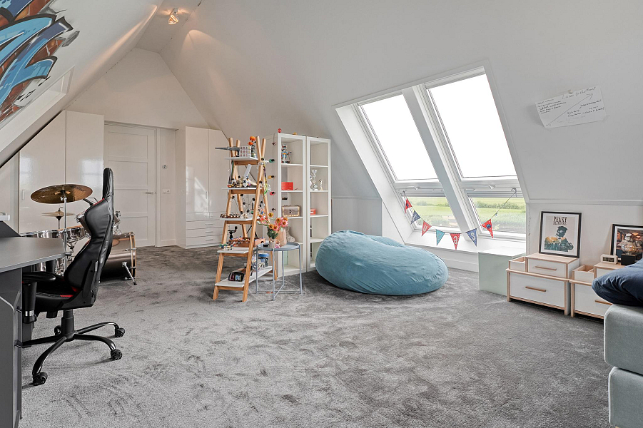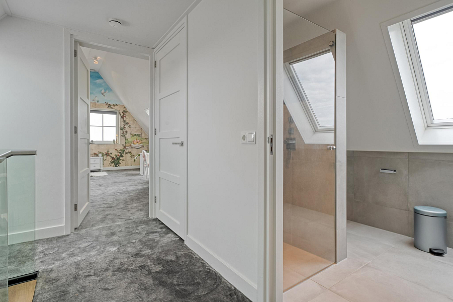 Zolderverdieping: Vaste trap naar 2e verdieping met een overloop met cv-ruimte, 2 zeer ruime slaapkamers met ruime berging. Beide slaapkamers zijn voorzien van dubbele Velux cabrio balkonvensters, waardoor hier ook een prachtig uitzicht op de landerijen is gecreëerd. Via de overloop is de kinderbadkamer voorzien van inloopdouche, wastafel(meubel) en wandcloset gerealiseerd.