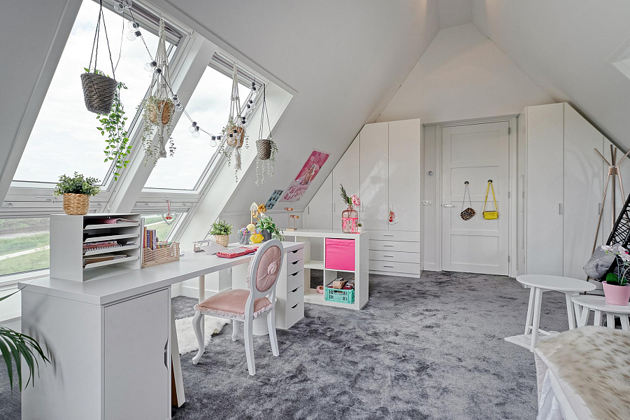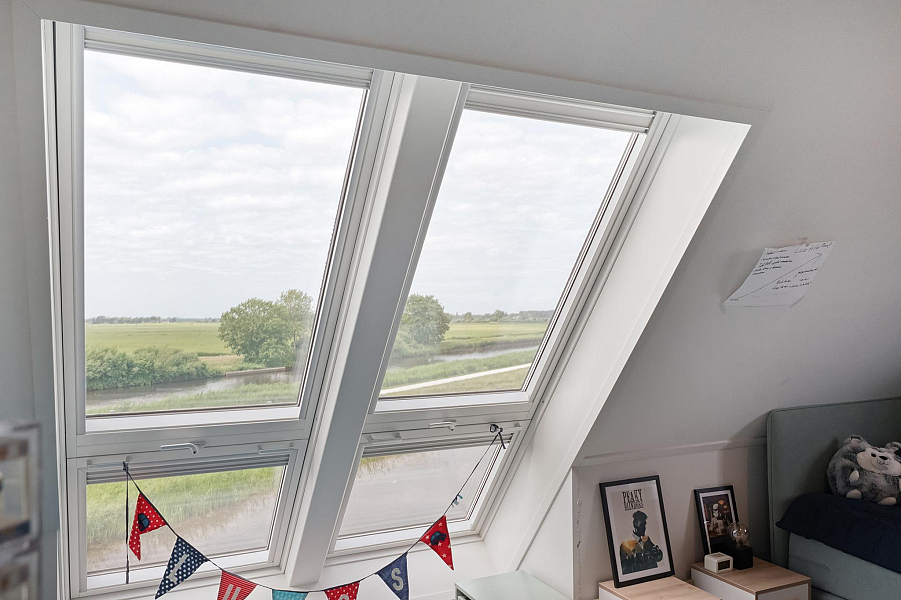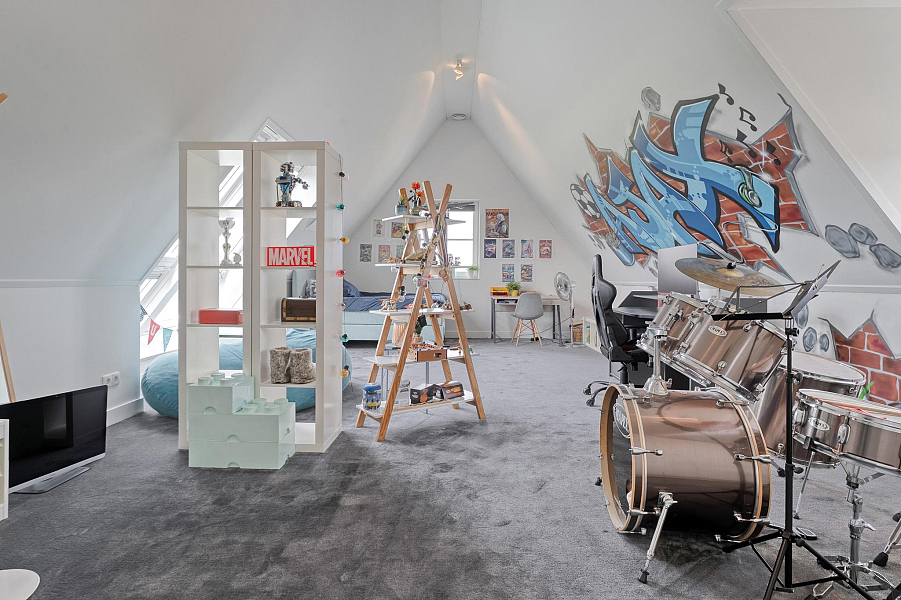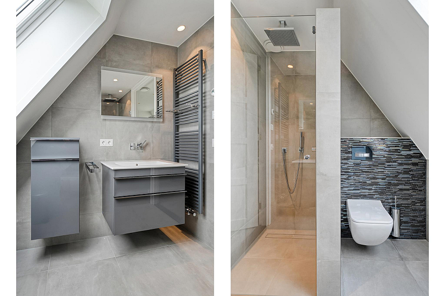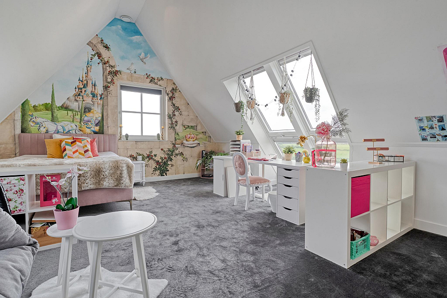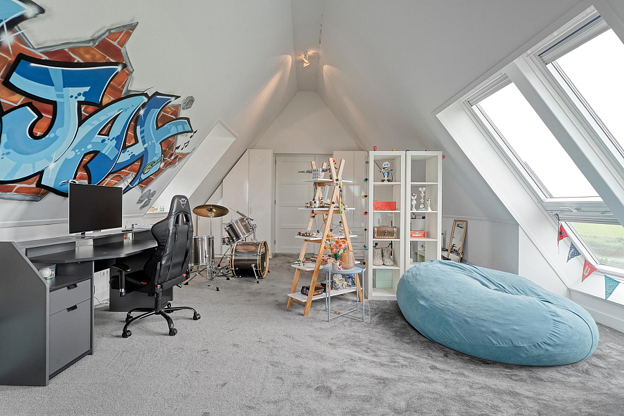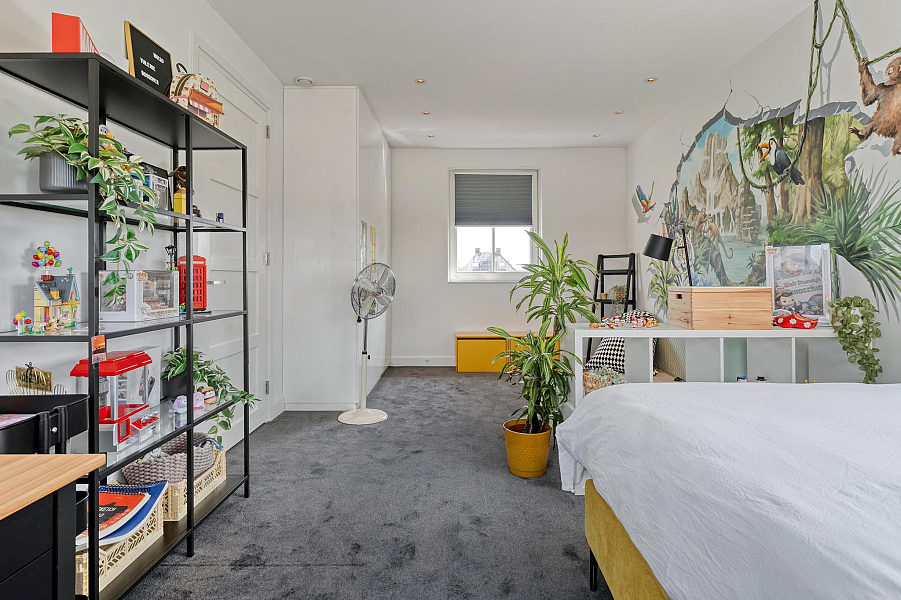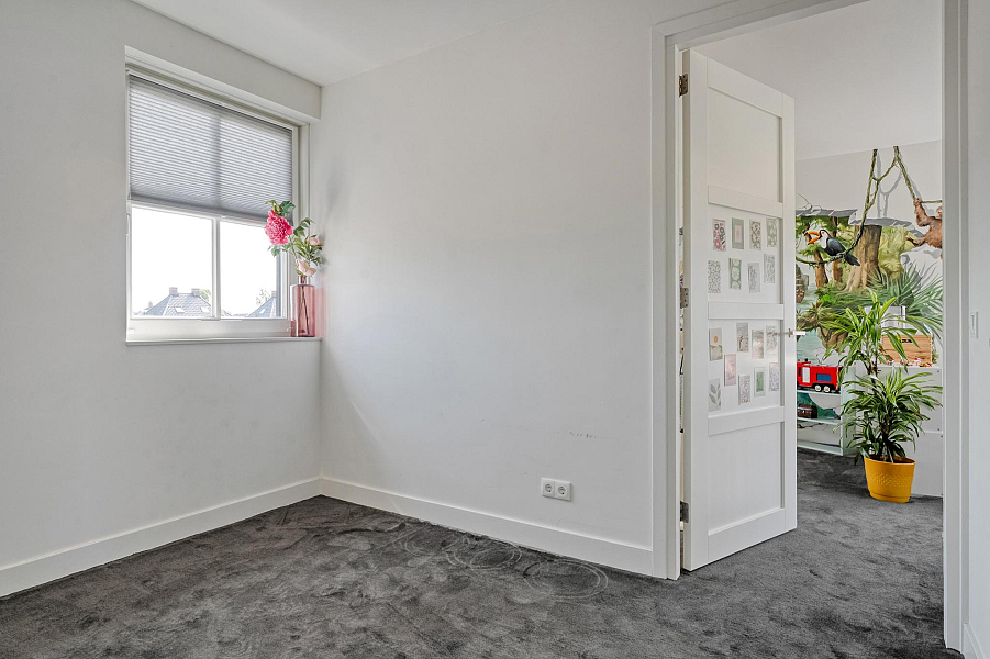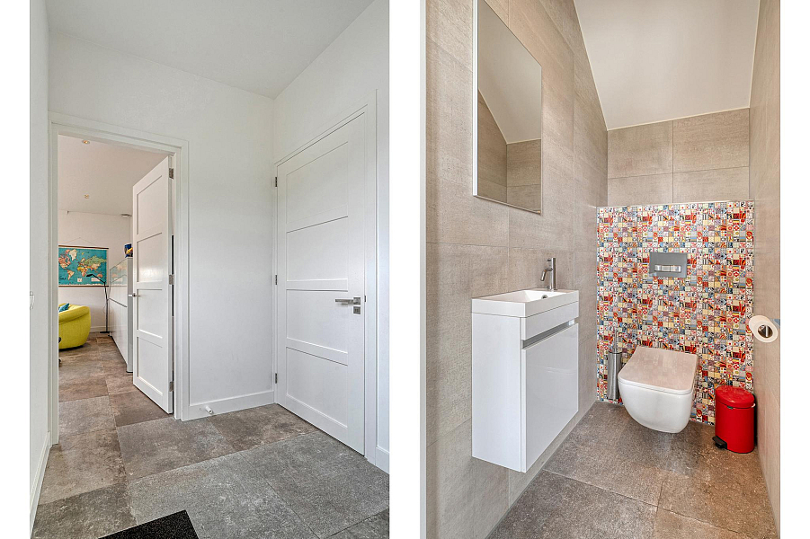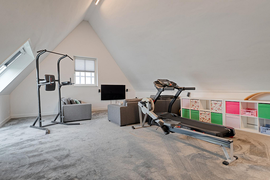 Zolderverdieping: Vaste trap naar 2e verdieping met een overloop met cv-ruimte, 2 zeer ruime slaapkamers met ruime berging. Beide slaapkamers zijn voorzien van dubbele Velux cabrio balkonvensters, waardoor hier ook een prachtig uitzicht op de landerijen is gecreëerd. Via de overloop is de kinderbadkamer voorzien van inloopdouche, wastafel(meubel) en wandcloset gerealiseerd.