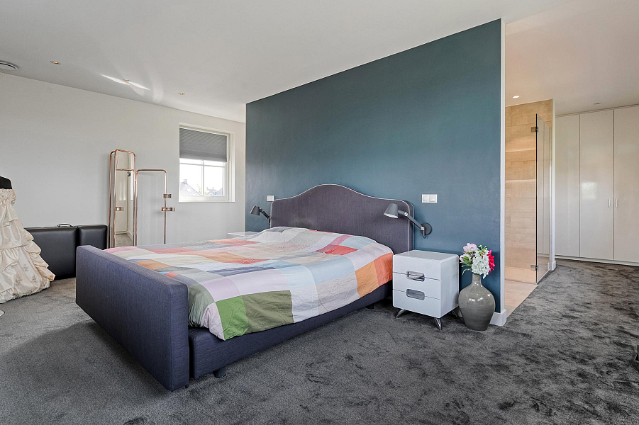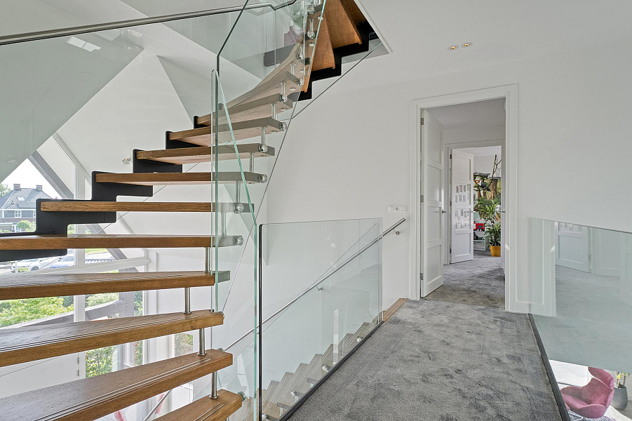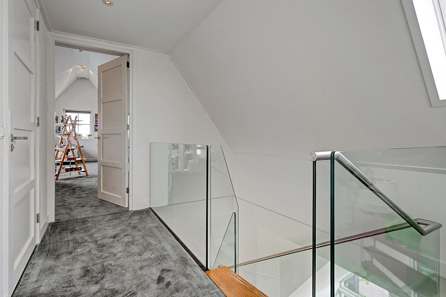 Exclusieve trapopgang met massief eiken treden en glazen balustrade, 2 slaapkamers (hoogbouw dus rechte gevels op de verdieping), waarvan de vleugel met ouderslaapkamer is voorzien van een kastenwand, frans balkon met dubbele deuren en een fantastisch uitzicht over de landerijen. Tevens ingericht met een zeer ruime badkamer met ligbad, inloopdouche met sunshower, voorzien van transparante tussenwand, toilet, dubbele wastafel in meubel en vloerverwarming. In de andere vleugel is een royale slaapkamer met vaste kastenwand en luxe badkamer voorzien van ligbad, inloopdouche, dubbele wastafel(meubel) en wandcloset. Vanuit de zijvleugel is via de bijkeuken een vaste trap naar de verdieping, waar een prachtige ruimte is gecreëerd. Ideaal voor een sportruimte of extra slaapkamer(s). ook is hier nog extra bergruimte aanwezig.
