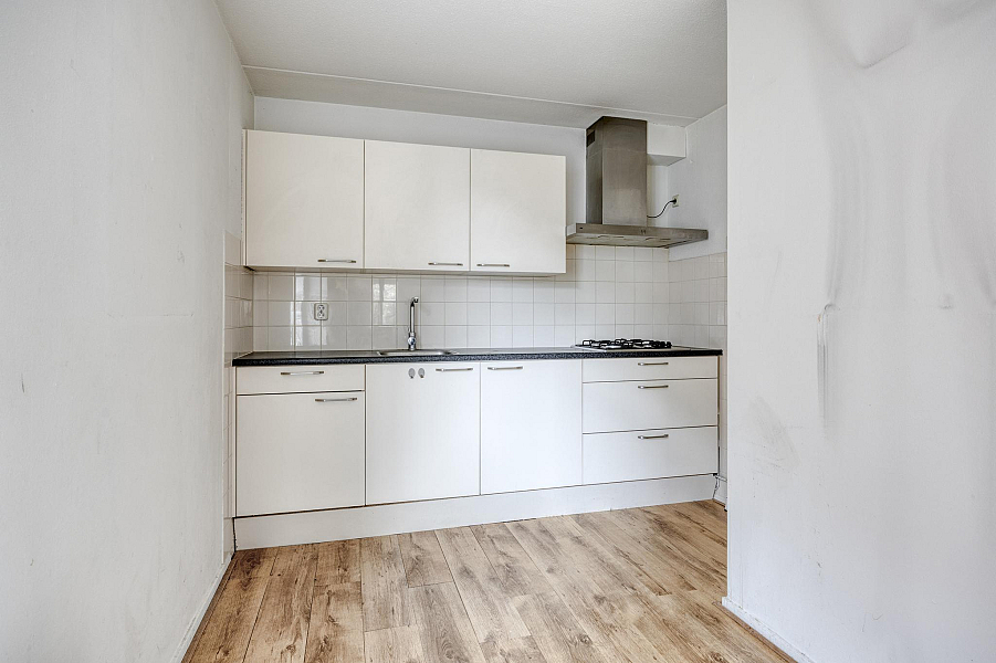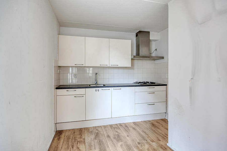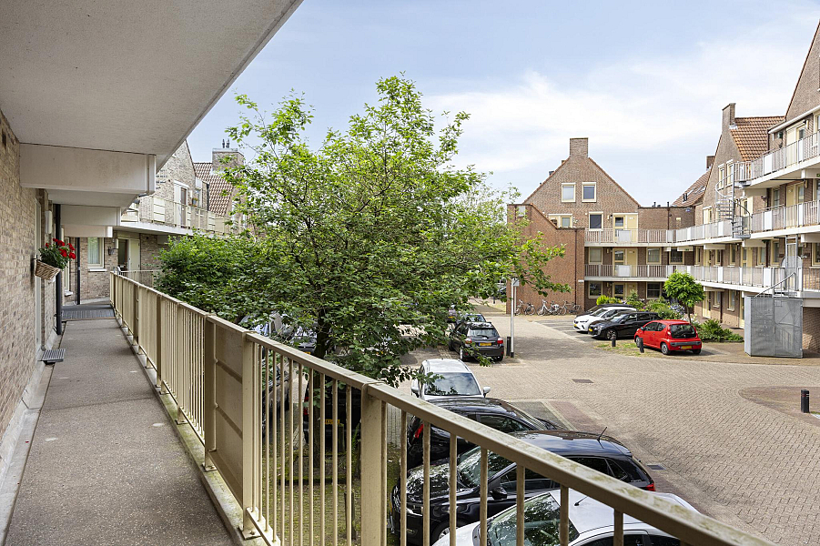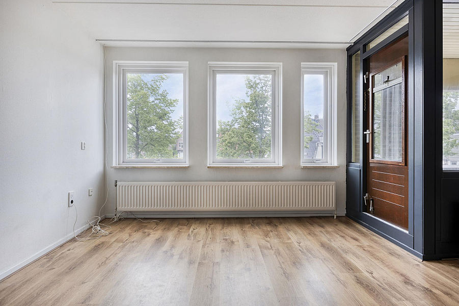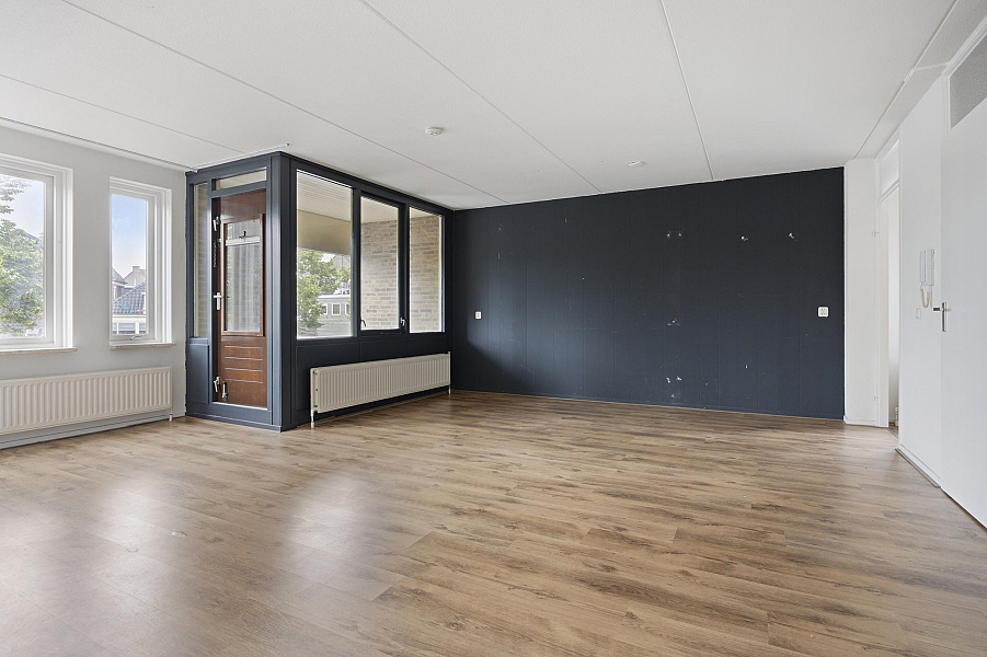 Aan de voorzijde bevindt zich de speelse en lichte woonkamer met laminaatvloer en toegang tot de keuken. Het balkon is te bereiken middels een deur in de woonkamer. Vanuit de woonkamer en het balkon heb je prachtig uitzicht op de Stoombootkade.