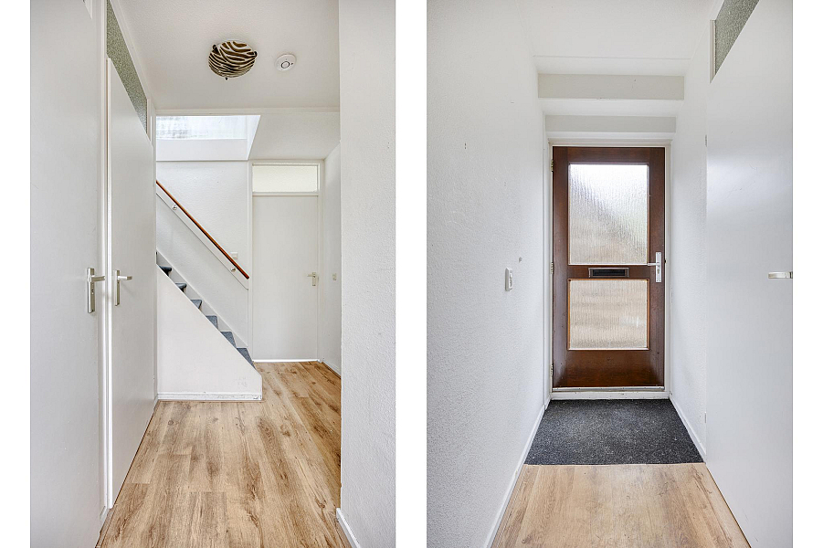Entree met de royale hal, meterkast, toilet met fonteintje, bergruimte met CV-ketel en witgoedaansluiting, trapopgang naar de verdieping en toegang tot de woonkamer.