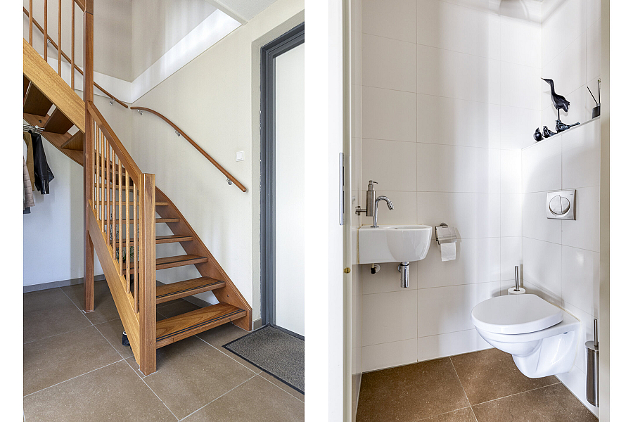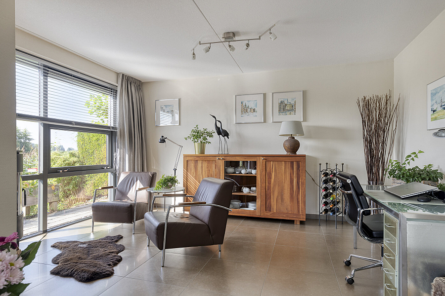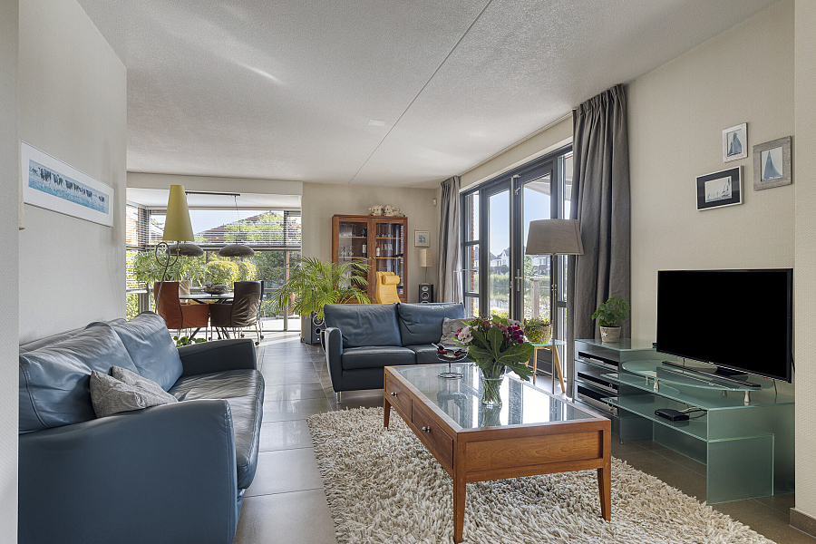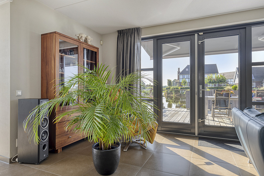 Entree/hal met fraai trappenhuis, toiletruimte met wandcloset en toegang tot de garage met eventueel een opstelplaats voor de wasmachine (thans op zolder), tuin/water gerichte living (circa 55 m2) met Faber gashaard en prachtig vrij uitzicht, terrasdeuren en fraaie erker, open keuken met luxe keukeninrichting en alle denkbare inbouwapparatuur (o.a. 5-pits inductiekookplaat, vaatwasser, boiler, combi steamer, combi magnetron, hete lucht oven, vaatwasser en grote koeler en grote vriezer). De ruime living biedt veel indelingsmogelijkheden met eventueel een separate zithoek. De begane grondvloer is voorzien van prachtige keramische vloertegels met vloerverwarming.