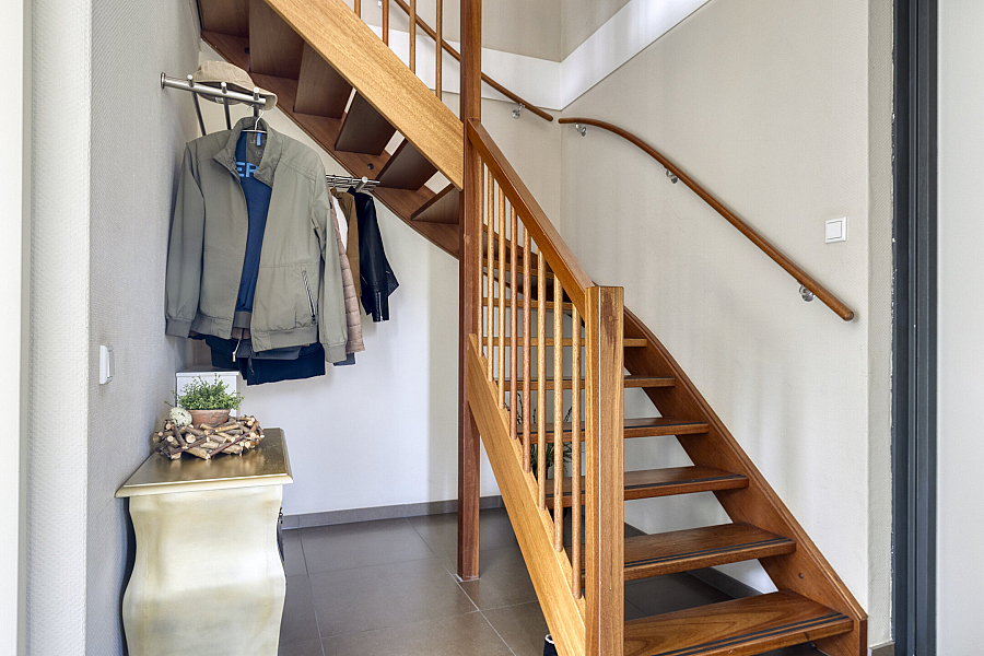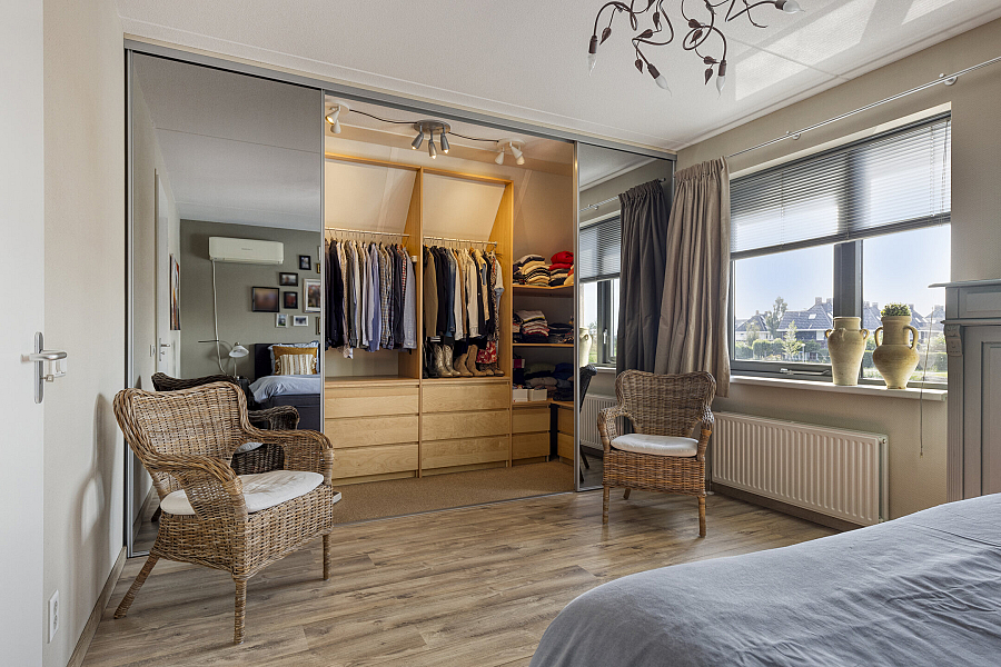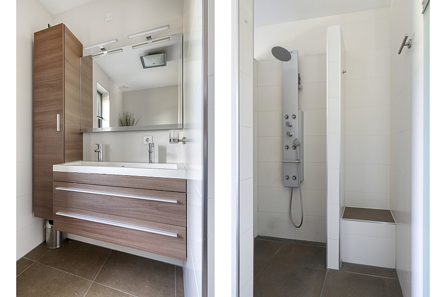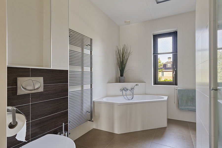 Overloop, 3 slaapkamers (waarvan 1 met ruime inloopkast en airco). De slaapkamers zijn circa 23, 10 en 8 m2 groot. Ook de moderne badkamer met een ligbad, inloopdouche met bodyjets, wastafelmeubel en wandcloset is hier gesitueerd.