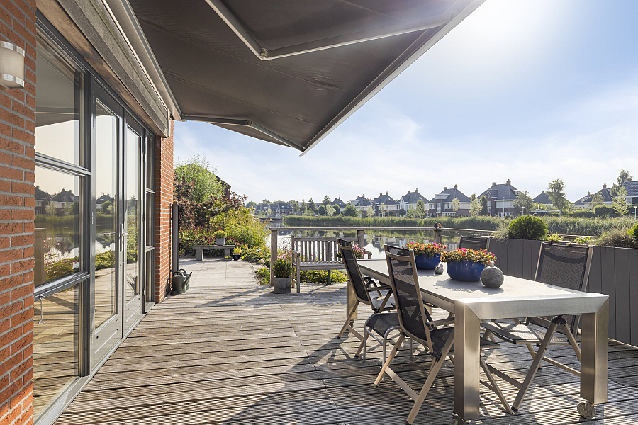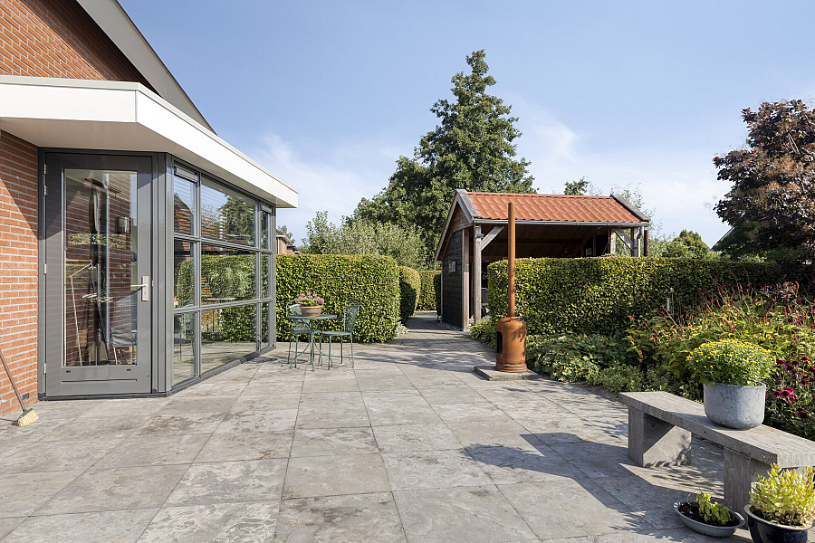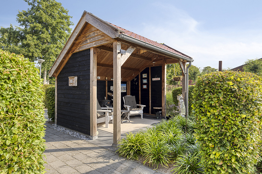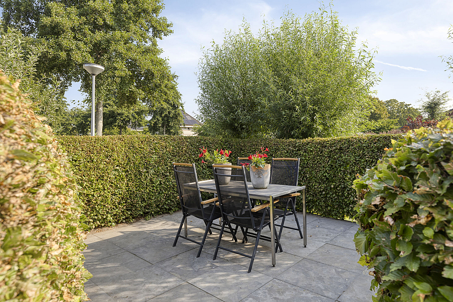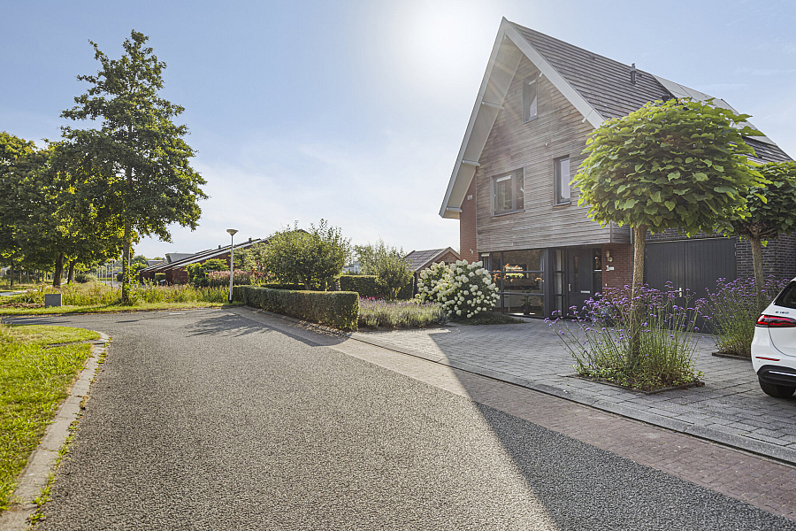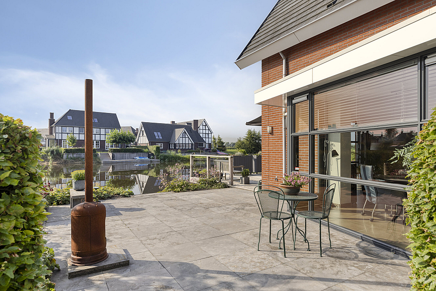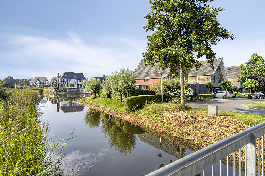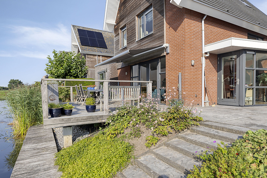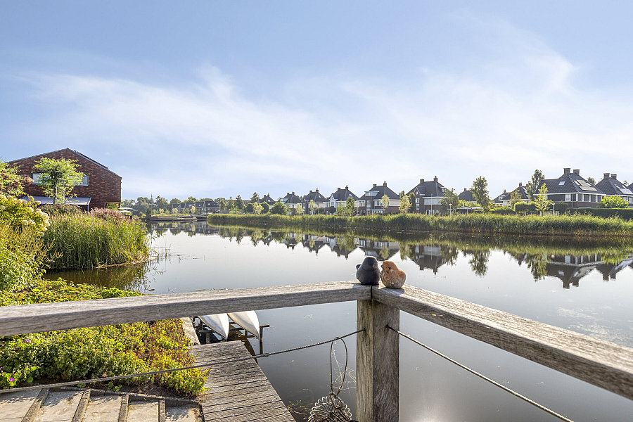 De prachtig onder architectuur aangelegde tuin, direct grenzend aan een brede waterpartij is voorzien van diverse mooie grote (vlonder) terrassen gelegen op het zuiden en ook is er, omdat de woning op een vrije hoek locatie is gelegen, een gedeelte waar lekker veel privacy is gecreëerd met een heerlijke overkapping (bouwjaar 2021). De oprit biedt ruimte voor 2 auto's.